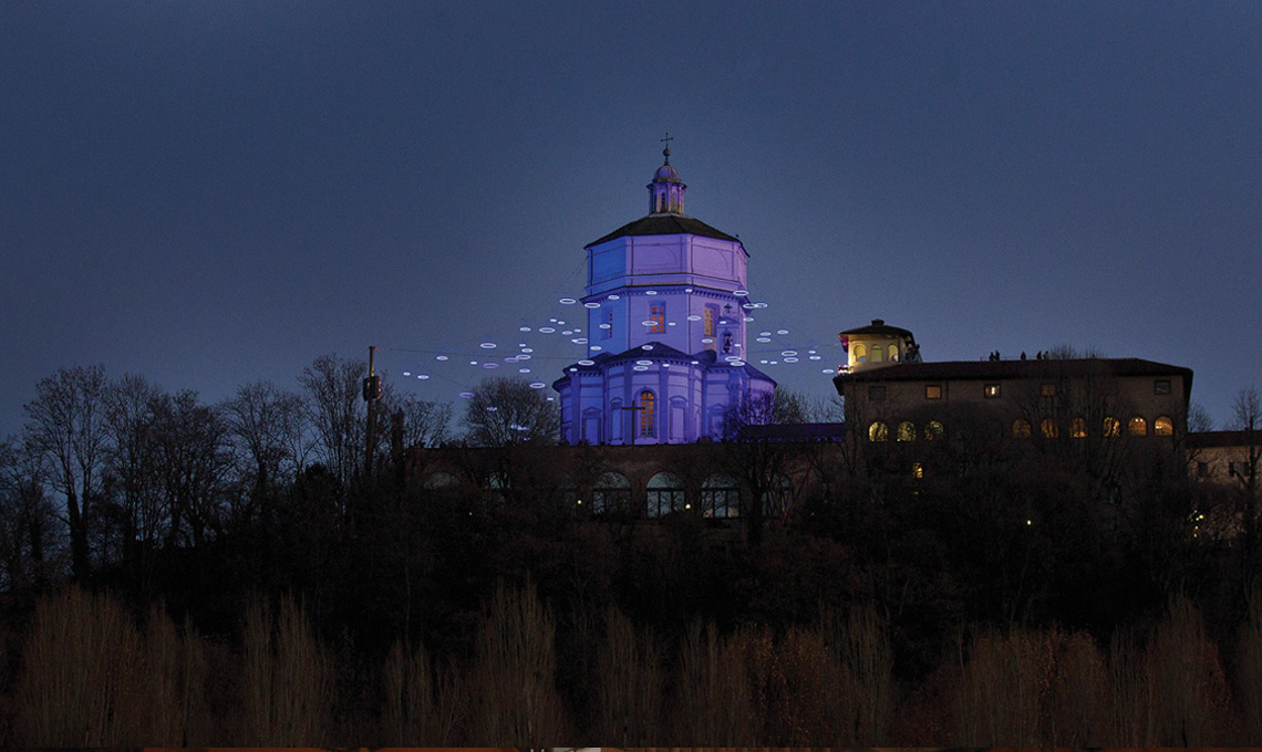 Di grande suggestione 'Piccoli Spiriti Blu' (anche questa permanente) di REBECCA HORN che avvolge in un’aurea azzurra la chiesa di Santa Maria del Monte dei Cappuccini e la circonda di anelli trasparenti luminosi, visualizzando l’energia impalpabile del luogo.