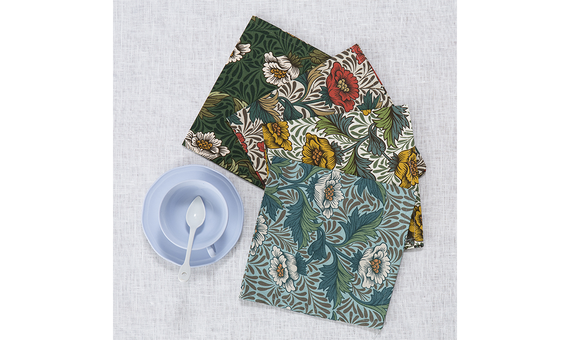 Morris Collection. Uno dei motivi iconici e inconfondibili del grande artista inglese, le peonie, è declinato in quattro colori diversi per questi set di tovaglioli dallo stile senza tempo. Da usare a contrasto con tovaglie in tinta unita dalle tinte neutre.