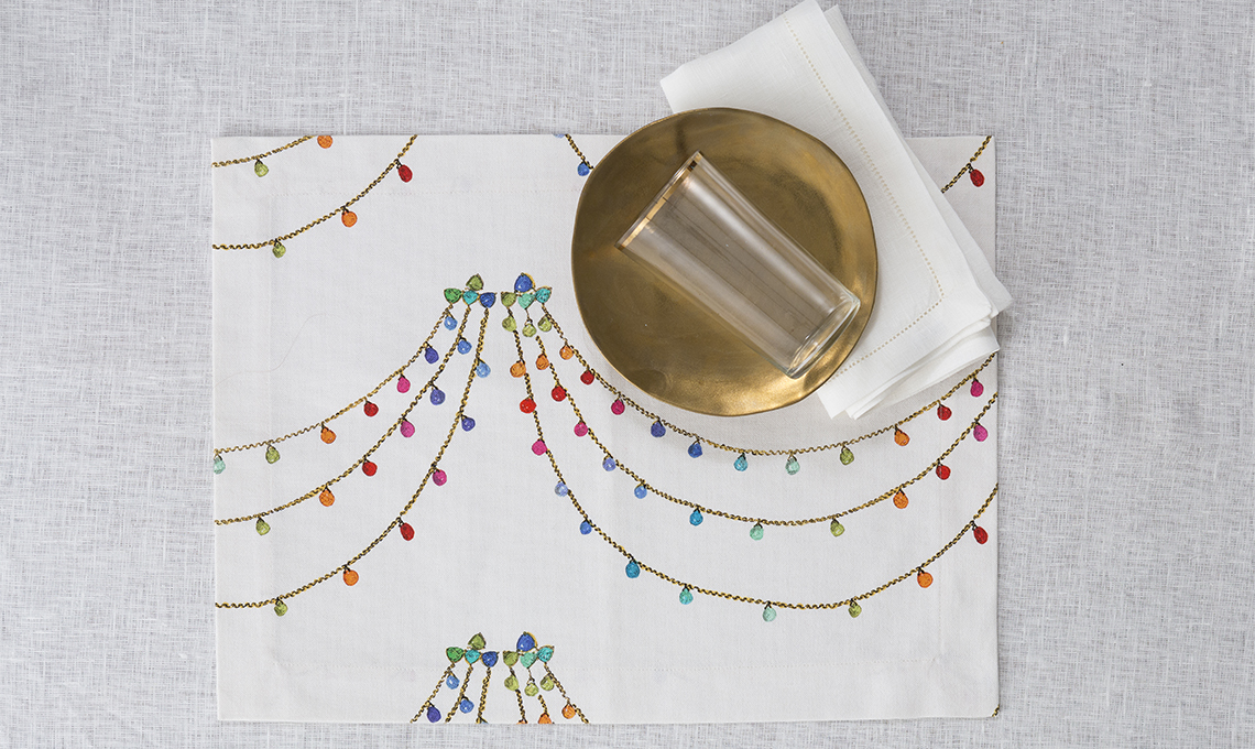 The Jewel Collection. Una cascata di pietre e catene d’oro per una tavola femminile e originale. Sdrammatizzata dal tratto sfumato pittorico e dai colori caramella. Per tovagliette americane, tovaglie su misura e runner in puro cotone abbinate a tovaglioli bianchi o colorati in lino con orlo à jour.