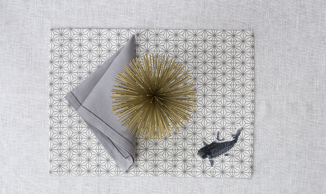 Origami Collection. Una grafica geometrica, una griglia elegante e delicata in bianco e grigio. Per tovaglie su misura, runner e tovagliette americane rigorose e di design abbinate a tovaglioli in lino bianchi o grigi con orlo à jour. In limited edition anche la versione con patch applicati a mano: un motivo classico di pesci in grigio tono su tono.