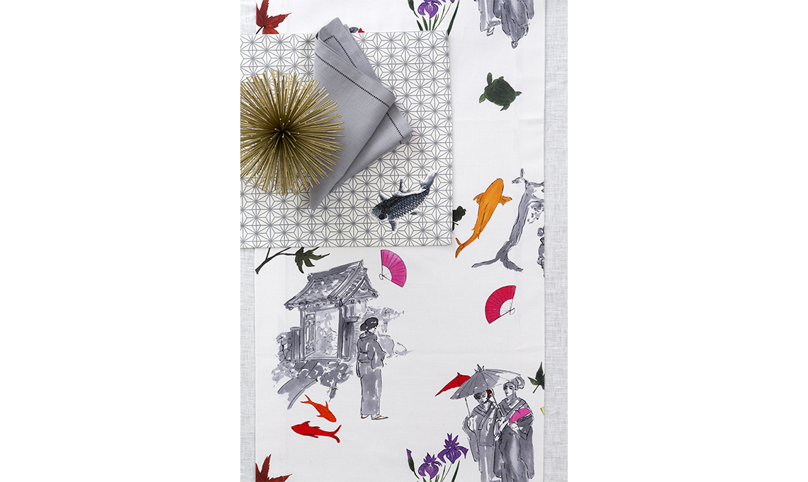 Zen Collection. Tra Oriente e Occidente, è una rivisitazione contemporanea e artistica della classica Toile de jouy. Una collezione adattabile tanto a uno stile classico che al contemporaneo e composta da runner e tovaglie su misura in puro cotone abbinate a tovaglioli in lino tinta unita.
