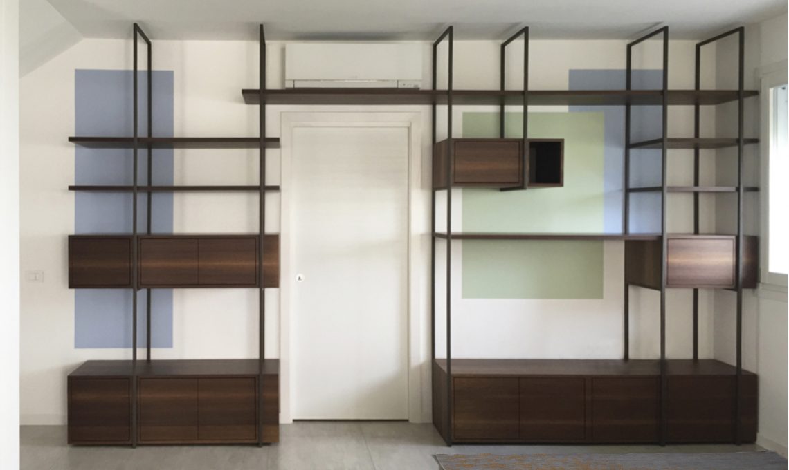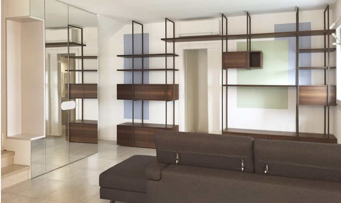 Per dare carattere alla parete del soggiorno, divisa al centro proprio da una porta che collega gli spazi di servizio della casa, è stata progettata una libreria in legno e metallo, dalle linee molto pulite e decise, che si sovrappone ad un gioco di campiture di colore realizzate sulla parete e che fa sfuggire all’occhio la presenza della porta scorrevole bianca e del condizionatore. I montanti in tubolari di metallo color grigio grafite, sorreggono dei pensili squadrati e delle mensole in legno e creano una composizione geometrica con i riquadri in verde menta e blu polveroso dipinti sulle pareti, richiamando le linee di un disegno astratto.