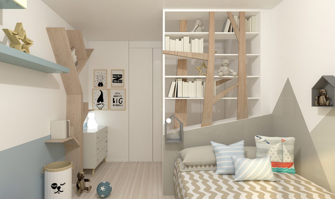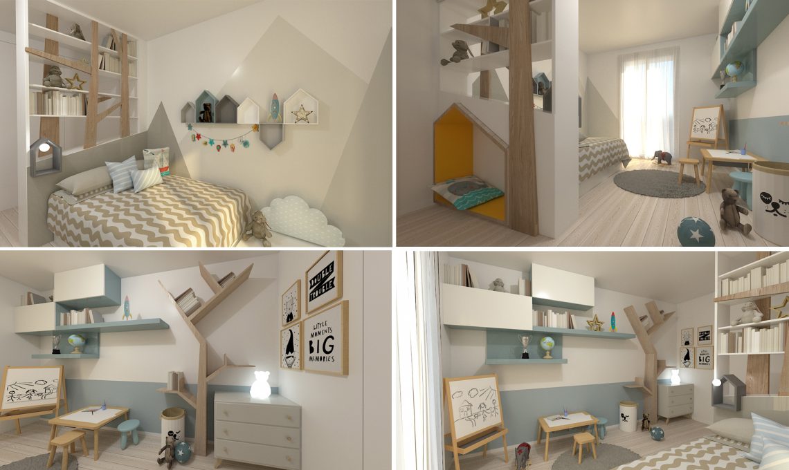 Nella stanza del figlio, un bambino solare e vivace è stata ricreata una foresta, inserendo degli alberi sia a parete che sulla libreria a giorno che funge da testiera del letto, in modo che lo spazio, sia per le forme che per i colori, fosse stimolante e vivace, adatto alla crescita e alla voglia di giocare di un bimbo della sua età. La libreria a giorno separa il letto dalla porta, dando intimità a questo spazio. Sulla struttura della libreria, laccata bianco , sono applicare le sagome di alberi in rovere spazzolato e, nella parte bassa, è stato inserito un “ nascondiglio”, una postazione per il gioco e la lettura a misura di bambino. Per le pareti è stata pensata una palette nei toni del grigio perla e dell’avorio, disegnando sagome di montagne, che si sposano ai toni caldi del rovere spazzolato di pavimento e mobili e all’azzurro carta da zucchero di pensili e mensole.