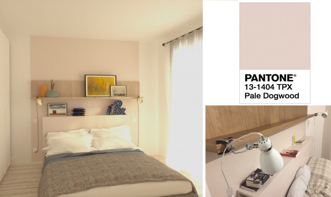 Nella camera matrimoniale è stata realizzata una testiera che oltre ad incorniciare il letto, svolge la funzione di comodino. Non essendoci lo spazio per posizionare mobili ai lati del letto, è stata pensata una testiera profonda, con uno spazio laterale per appoggiare libri e piccoli oggetti, in cui inserire anche gli interruttori e le prese di corrente. Sopra la testiera, incorniciata da una campitura di colore rosa cipria alla parete, c’è una mensola ad L finita in rovere spazzolato, su cui sono fissate delle lampade con pinza.