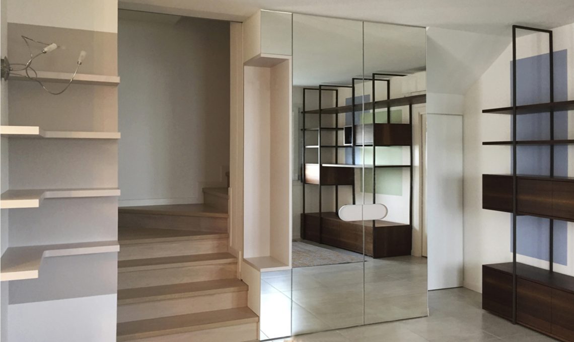 I committenti avevano richiesto di inserire un guardaroba-ripostiglio di fianco allo sbarco della scala che collega la zona notte, sfruttando questa occasione anche per nascondere la presenza di un elemento strutturale. Per questo è stato previsto un armadio con due grandi ante rivestite in specchio, che dilatano lo spazio del soggiorno riflettendo la luce e rendendo l'ambiente molto luminoso. Visivamente l’armadio è collegato alla parete a sinistra della scala utilizzando un colore beige-sabbia bagnata per la realizzazione, da un lato di una nicchia incassata e, dall’altro, di una zona arredata con mensole ad “L” tono su tono.