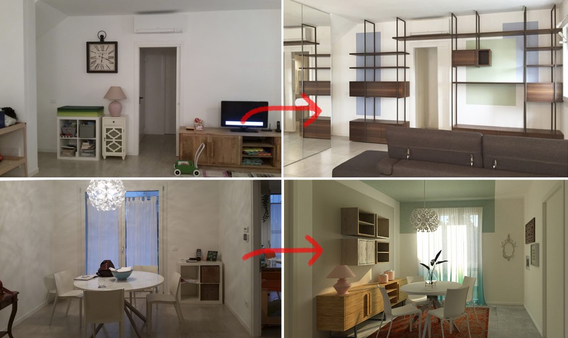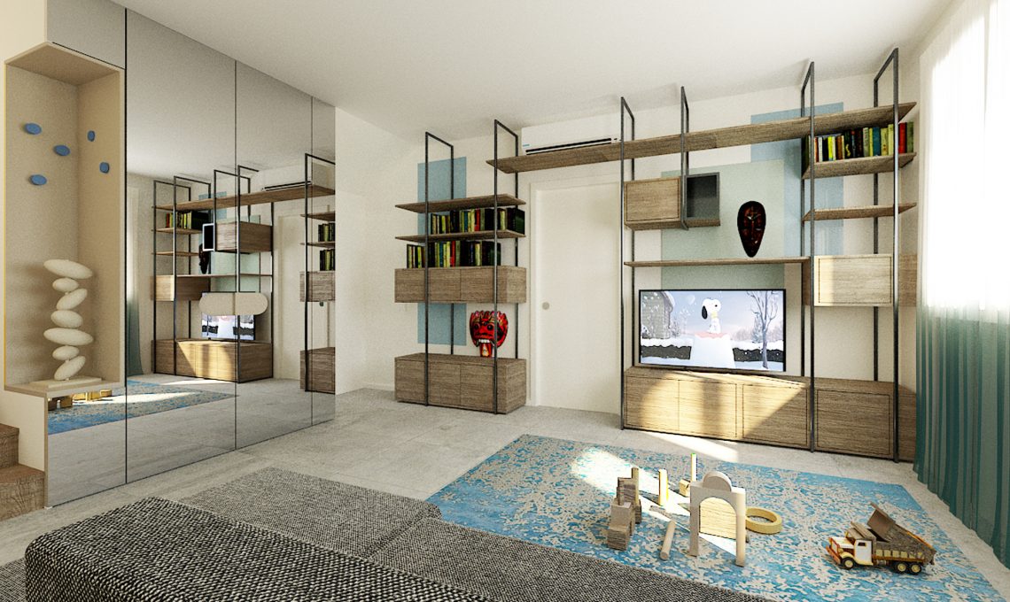 Il progetto vuole dilatare lo spazio inserendo gli specchi a chiusura del guardaroba vicino alle scale e dare unità alla parete tv, dove la porta ed il condizionatore 'spariscono' nella libreria a giorno.