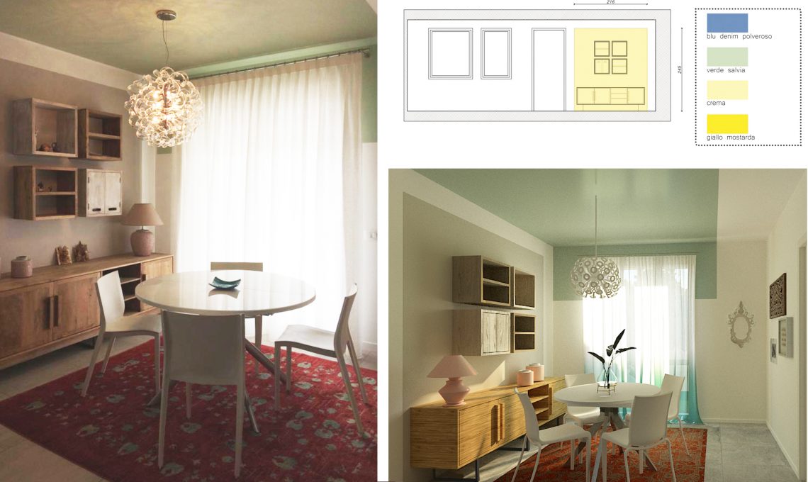 Nella zona pranzo sono stati inseriti alcuni arredi in legno spazzolato a cui la famiglia era affezionata. Il mobile Tv è diventato una madia per i piatti, rialzandolo con dei piedini metallici che riprendono i montanti della libreria della zona giorno. Accanto alla scala erano appoggiati uno sull’altro quattro moduli in legno che venivano utilizzati come libreria; appesi alla parete si sono trasformati in una composizione di pensili in diverse tonalità di legno. Per trasformare la zona pranzo l’intervento è stato minimo: sono state realizzate due aree di colore che individuano volumetricamente lo spazio e gli danno una propria intimità. A parete c’è un riquadro beige che incornicia i pezzi di arredo di recupero; a soffitto uno verde salvia, che con i riflessi e le ombre proiettati dal lampadario in vetro, crea un’atmosfera calda e soft. A pavimento è stato scelto un moderno tappeto persiano rosso con dettagli azzurri che, abbinato al tavolo e alle sedie di design, dalle linee minimal in total white, crea un contrasto interessante.