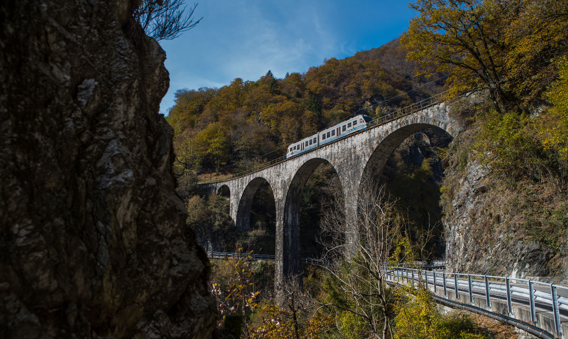 Percorrerai la ferrovia Vigezzina-Centovalli che da Domodossola, nell’Alto Piemonte, arriva in Svizzera, a Locarno. Inaugurata nel 1923, questa storica linea a scartamento ridotto definita 'la ferrovia panoramica più bella d’Italia', attraversa la Val d’Ossola, la Val Vigezzo (detta anche la Valle dei pittori), le Centovalli, così chiamate per le numerose valli laterali, per finire sul Lago Maggiore. Un percorso che attraversa suggestivi paesaggi, boschi e borghi di montagna, resi ancora più incantevoli dalle atmosfere autunnali.