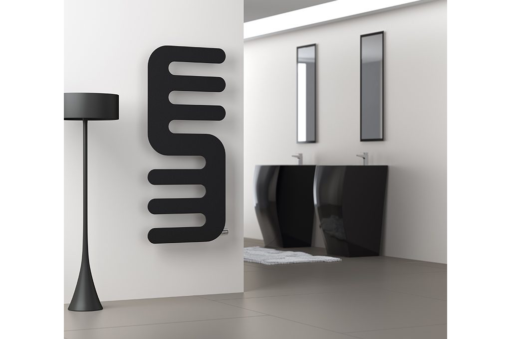 Design di grande impatto per lo scaldasalviette Hand (Cordivari). E’ formato da un unico corpo scaldante, in acciaio al carbonio verniciato, di cm 51,4x8x120h.