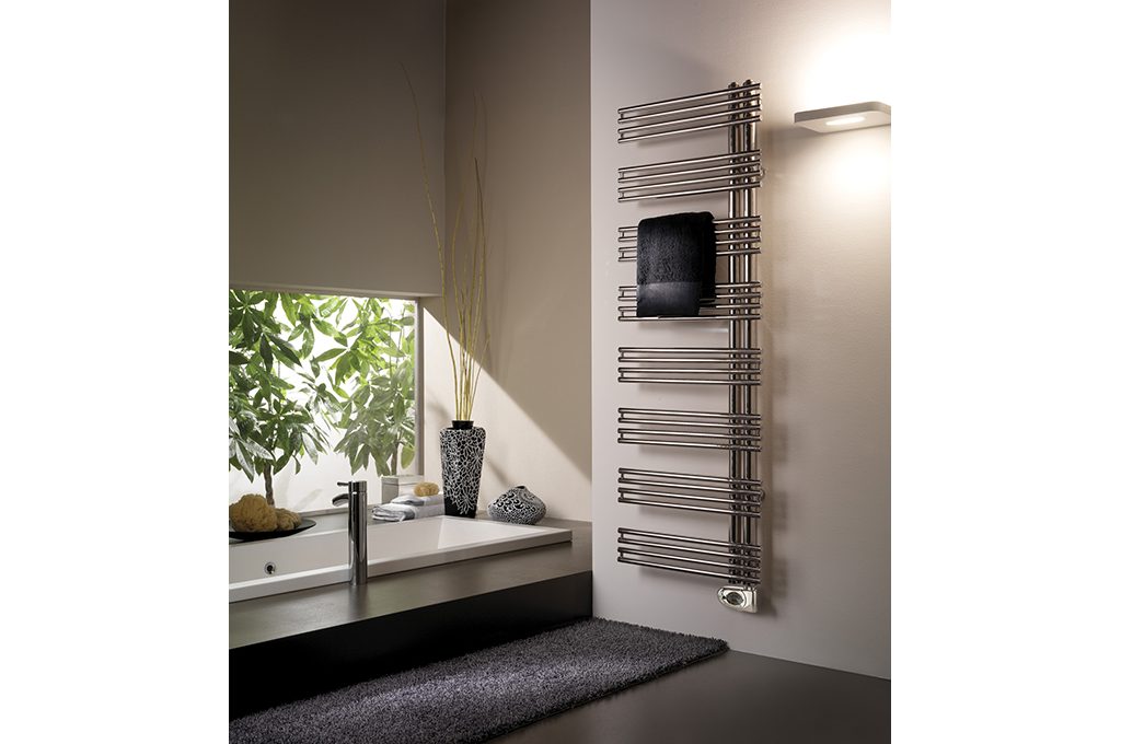 Termosifone elettrico Kelly (Cordivari) in acciaio inox lucido con due montanti laterali sostengono gli elementi radianti orizzontali che servono da scaldasalviette. Largo cm 50 e 60, è disponibile in 3 altezze
