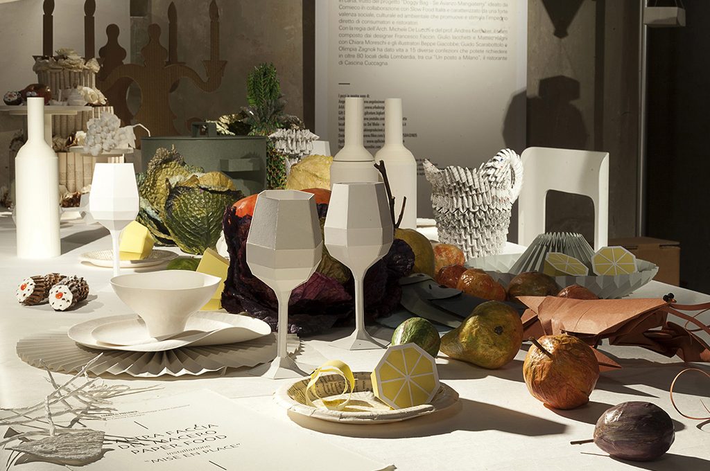 La tavola imbandita 'in carta' è esposta a Milano fino al 30 novembre da Paper & People, via Friuli 32; un invito a ricordare che carta e cartone possono avere mille vite.