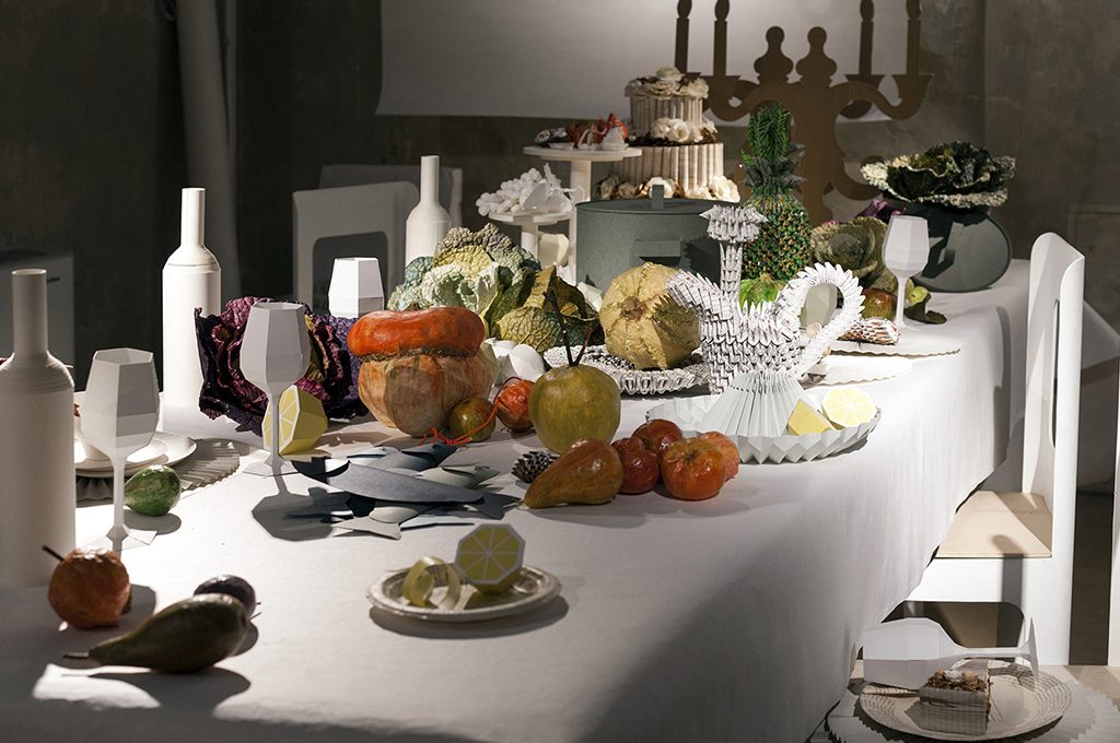 Riciclata o rigenerata e lavorata da mani sapienti, la carta si trasforma in mondi inaspettati, come questo banchetto imbandito.