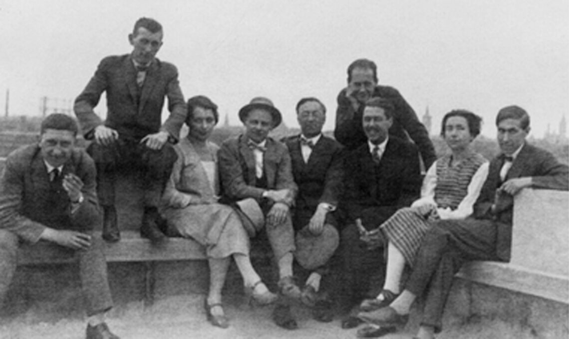 Alcuni dei maestri del Bauhaus a Dessau, luglio 1926. Da sinistra a destra Kosef Albers, Marcel Breuer, Gunta Stölzl, Oskar Schlemmer, Wassily Kandinskij, Walter Gropius, Herbert Bayer, Lucia Moholy, Hinnerk Scheper.