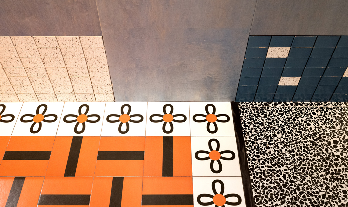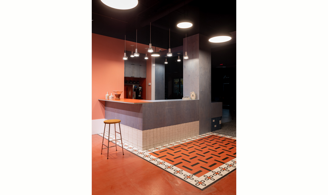 Il coffee shop ha un'atmosfera diversa e il cambiamento è segnato prima di tutto dai toni terracotta e arancio utilizzati per il pavimento e per le pareti. Qui il pezzo forte è sicuramente il ‘tappeto’ di piastrelle Margherita di Mutina, disegnate da Nathalie Du Pasquier.