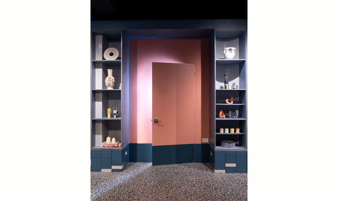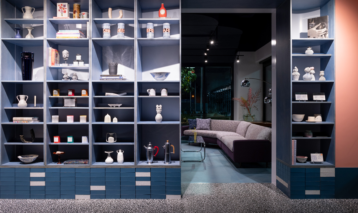 Il design è allo stesso tempo minimale e d'effetto e divide lo spazio in tre: la galleria principale colpisce a prima vista, grazie alla grande scaffalatura blu, poggiata su un basamento di piastrelle blu e bianche e su un pavimento terrazzo in bianco e nero.
