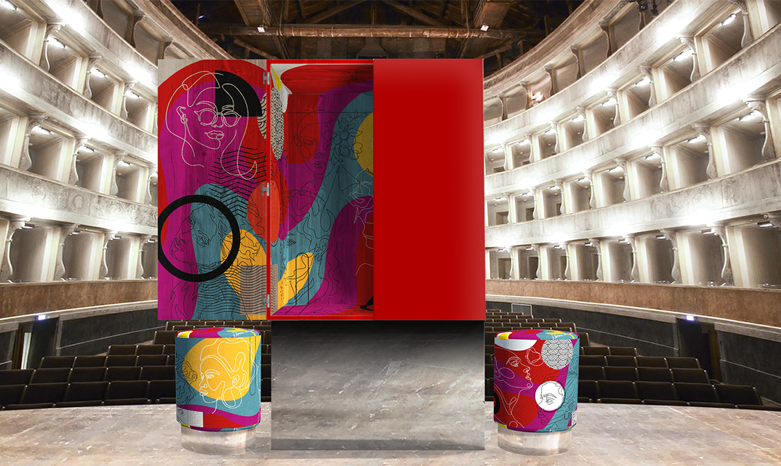 Quando le ante della madia si aprono, come le tende sul palco di un teatro, si rivela lo spettacolo interno: la texture disegnata da Luciana Gomez, con rimandi all’universo femminile e a tutte quelle ispirazioni nate dal racconto e dal confronto con le donne di Amleta. Il pouf in ecopelle e base a specchio, interamente decorato con la stessa texture della madia, richiama nuovamente il mondo del teatro e del cinema con i suoi backstage e i camerini per il trucco.
