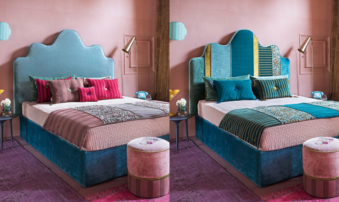 I ‘vestiti’ del letto. Copriletto o biancheria in tinta unita e un runner prezioso ai piedi del materasso. Non possono mancare i cuscini d’arredo!