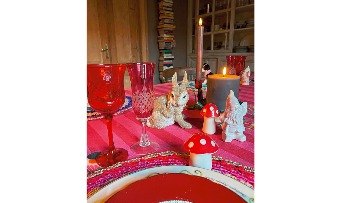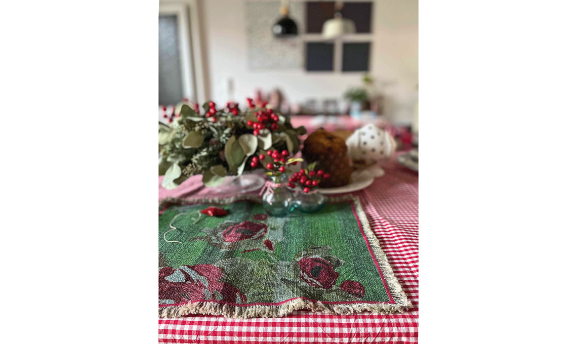 Preparare il tavolo e farne un piccolo capolavoro. Esagerare un po’. Io in genere non seguo le indicazioni del bon ton, ma invento tavole scomposte con tovaglia, sottopiatto, piatto piano e piatto dolce, mettendo insieme pezzi diversi tra loro. E non dimentichiamo di decorare anche il tavolo della colazione della mattina del 25! Sistemare bacche e fiori rossi in tutti i vasi e composizioni di mele rosse sulle alzatine.