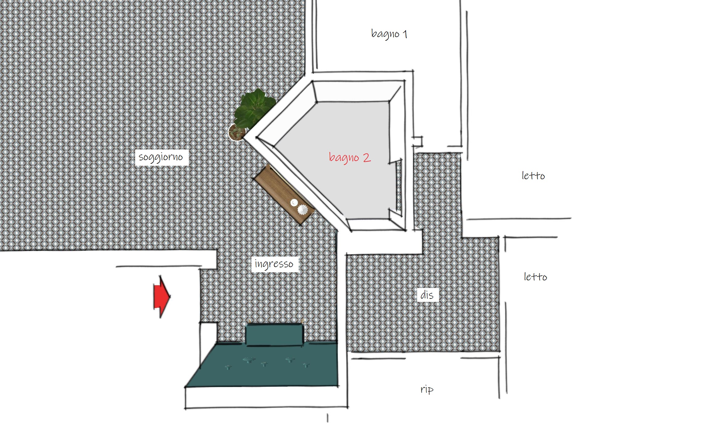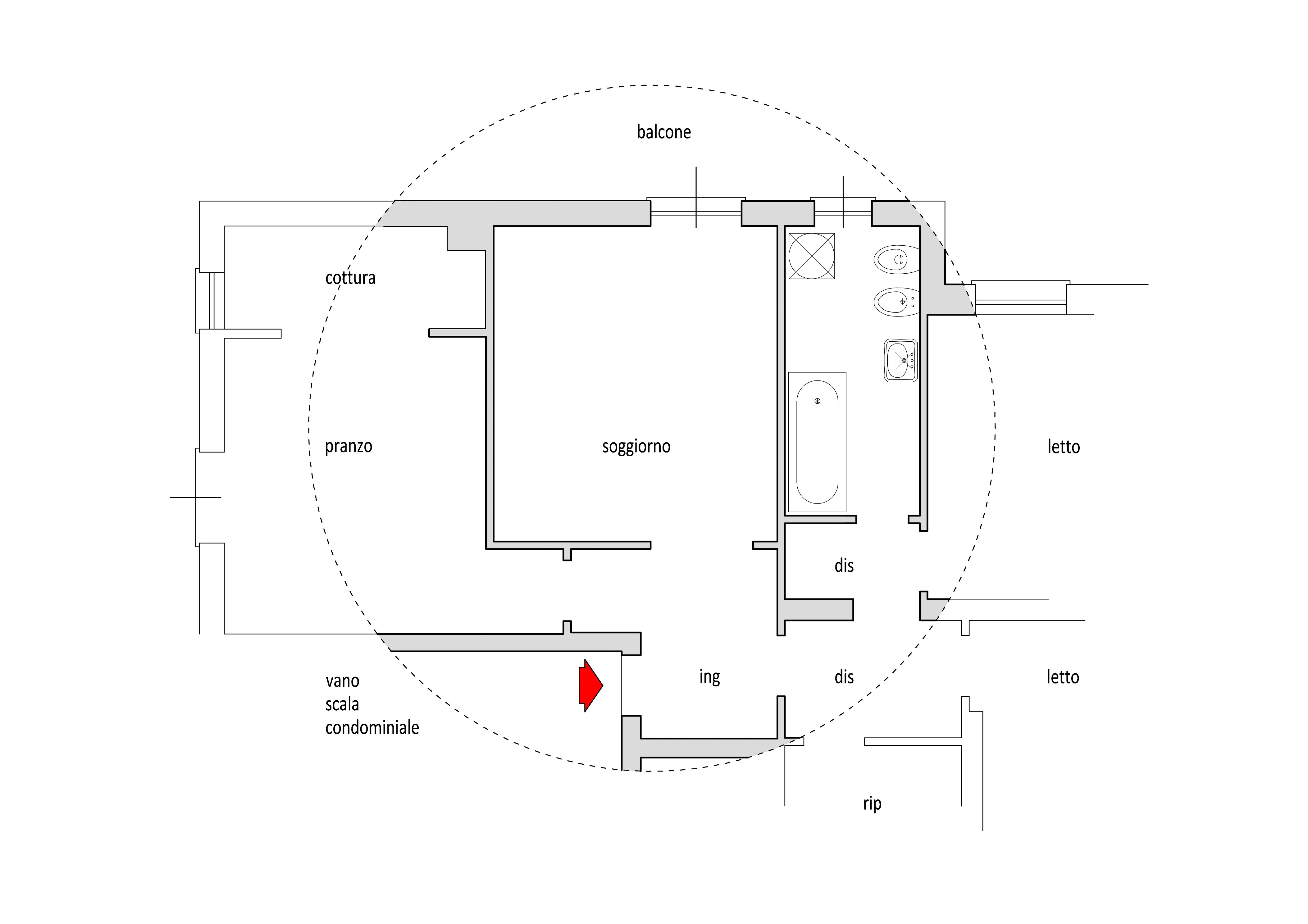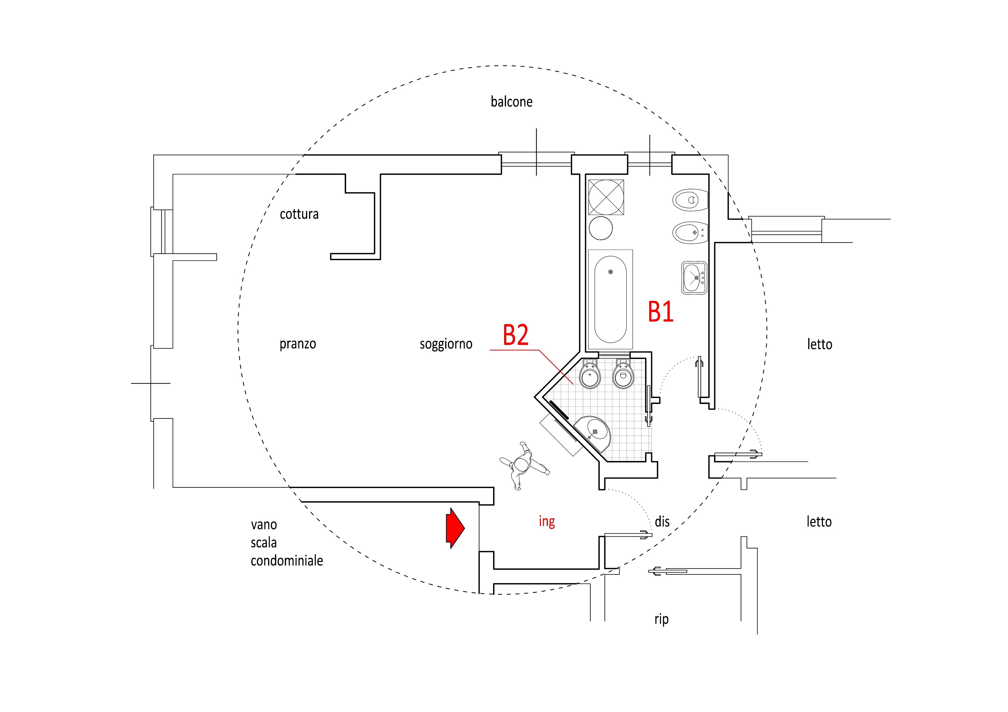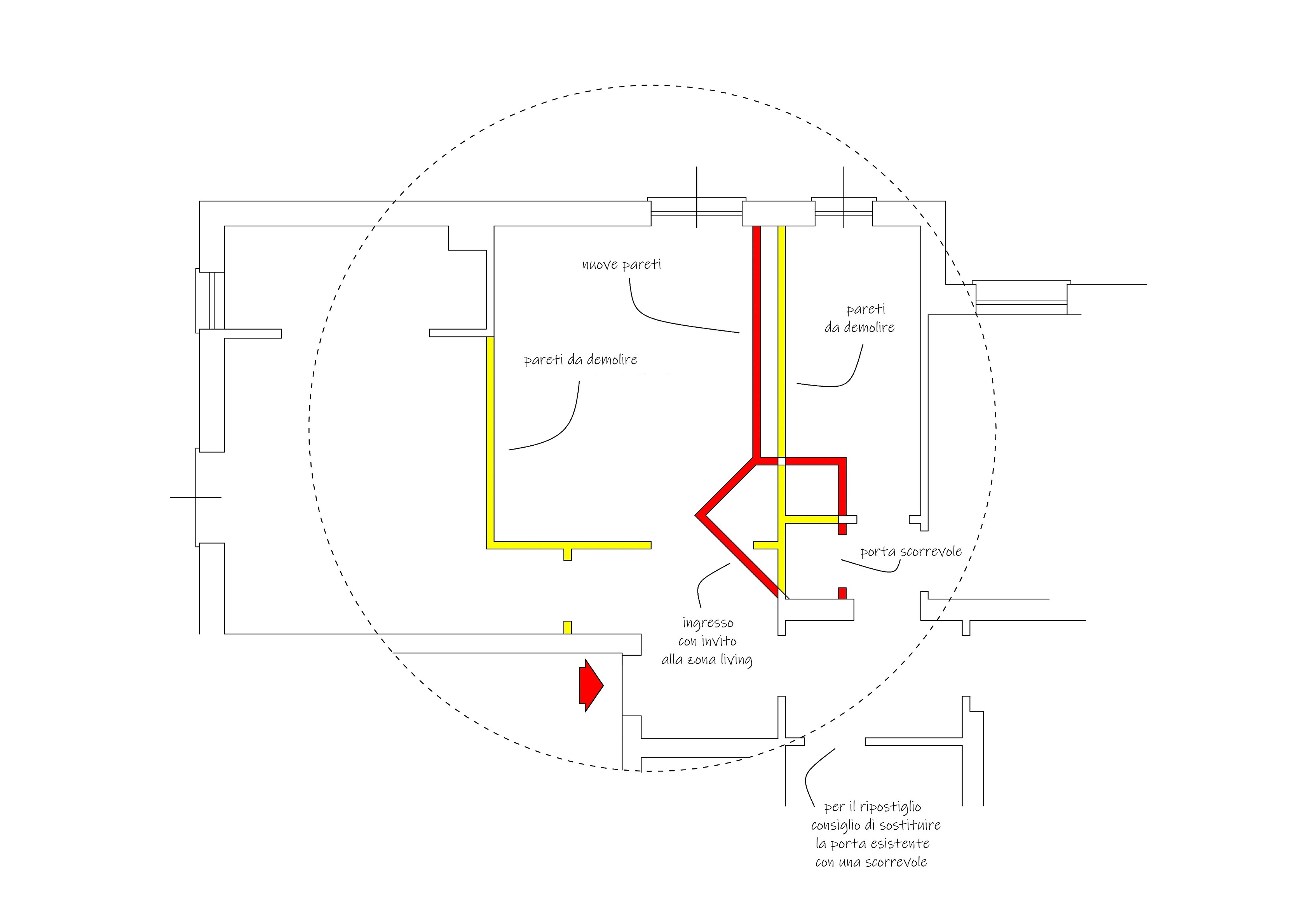 Ho ritagliato un po' di superficie da soggiorno, servizio igienico ed ingresso ed ho posizionato il nuovo bagno giorno. Quello esistente ha mantenute le stesse dotazioni ma ora risulta più proporzionato e fruibile. L'inserimento delle nuove partizioni ha risolto l'ingresso. Prima era buio ed angusto, indipendente e distaccato dal resto della casa. Ora parte integrante dell'appartamento e di invito alla zona living. La demolizione delle pareti tra pranzo e soggiorno ha permesso di ottenere un ambiente più attuale, visivamente più ampio e decisamente più luminoso, mantenendo gli spazi funzionali.