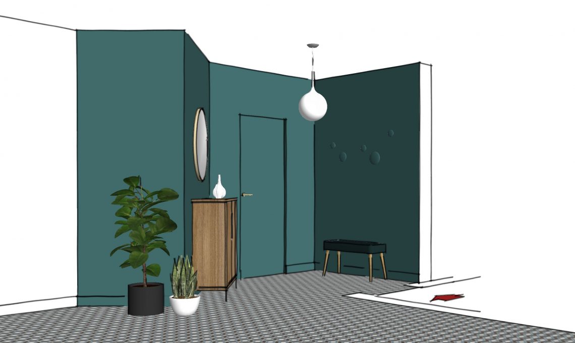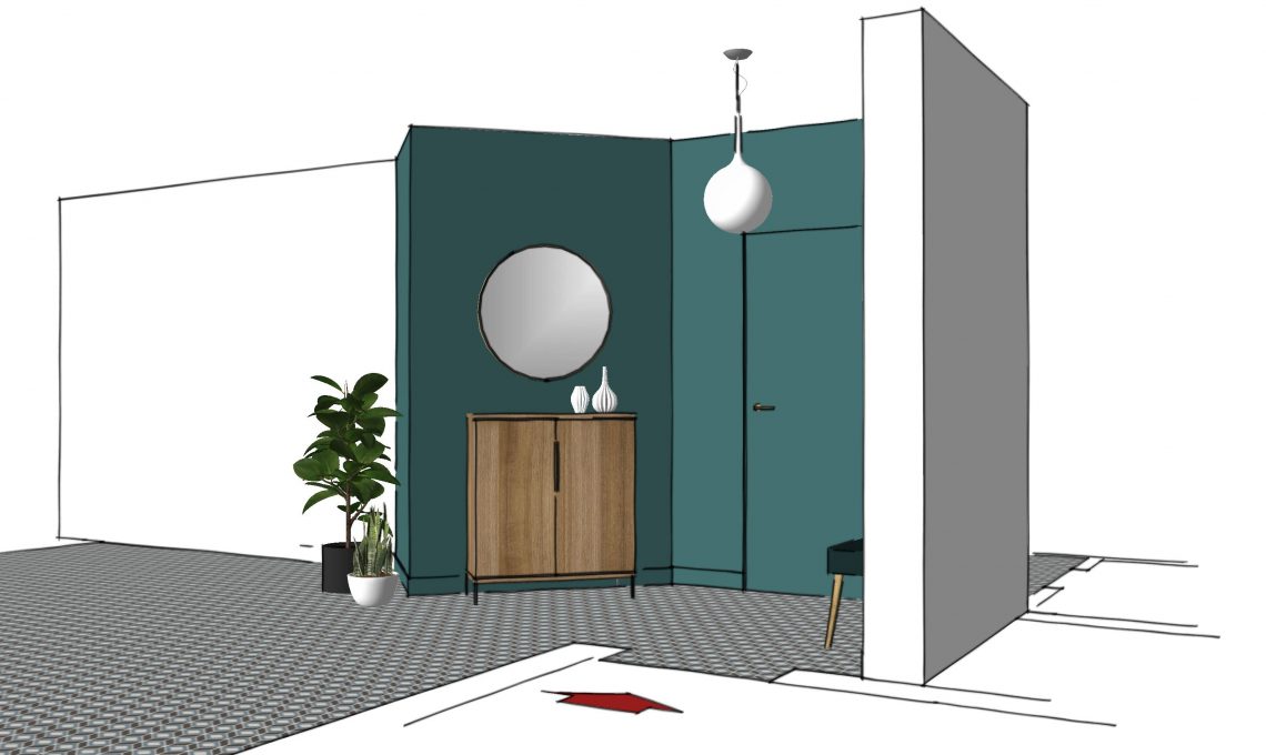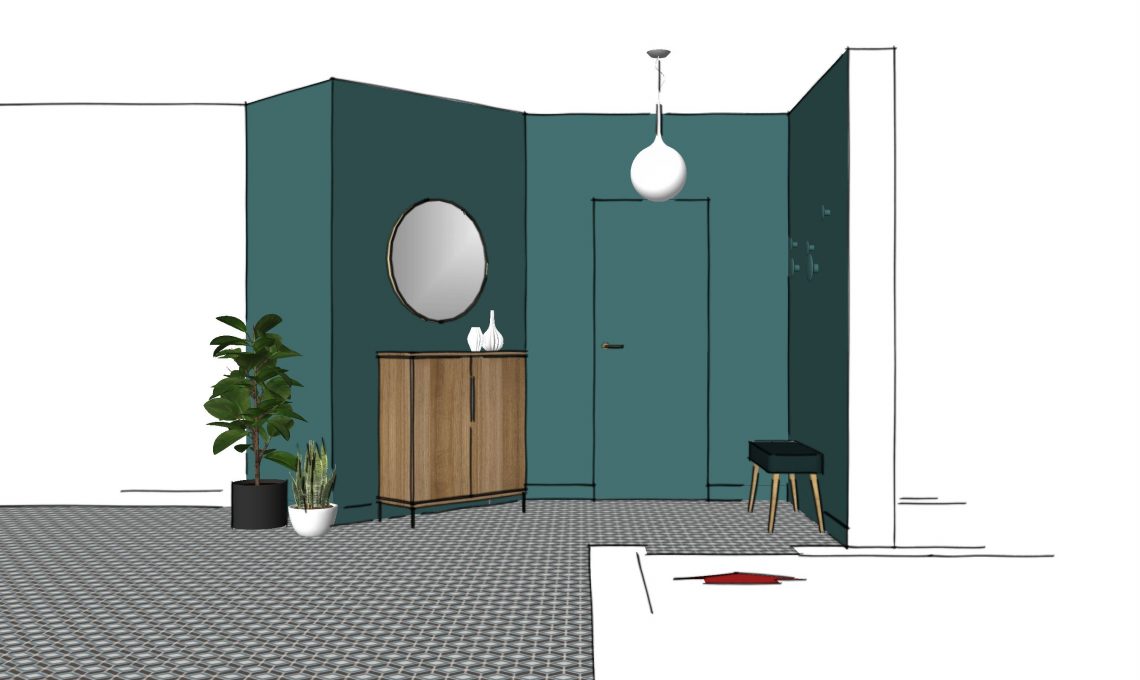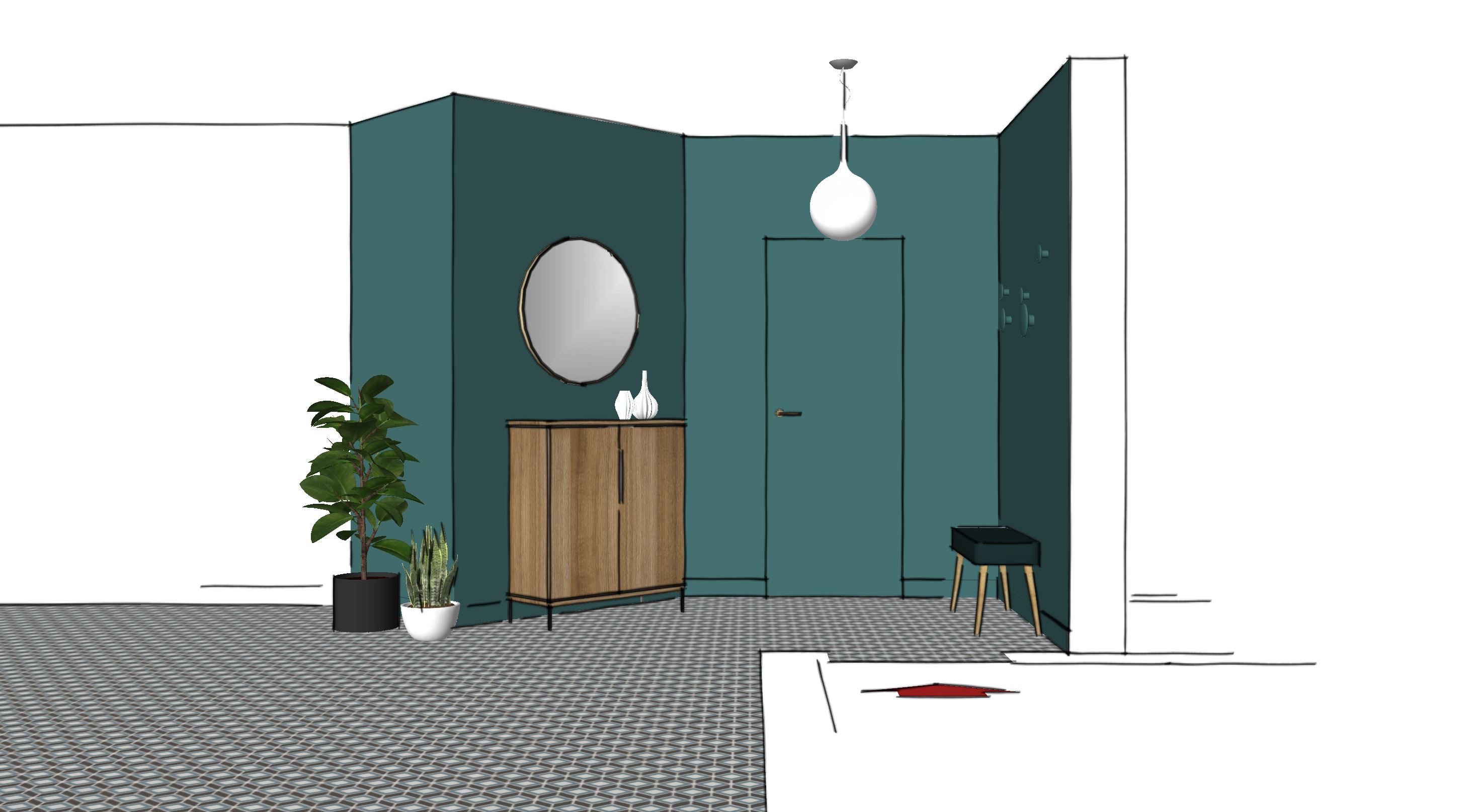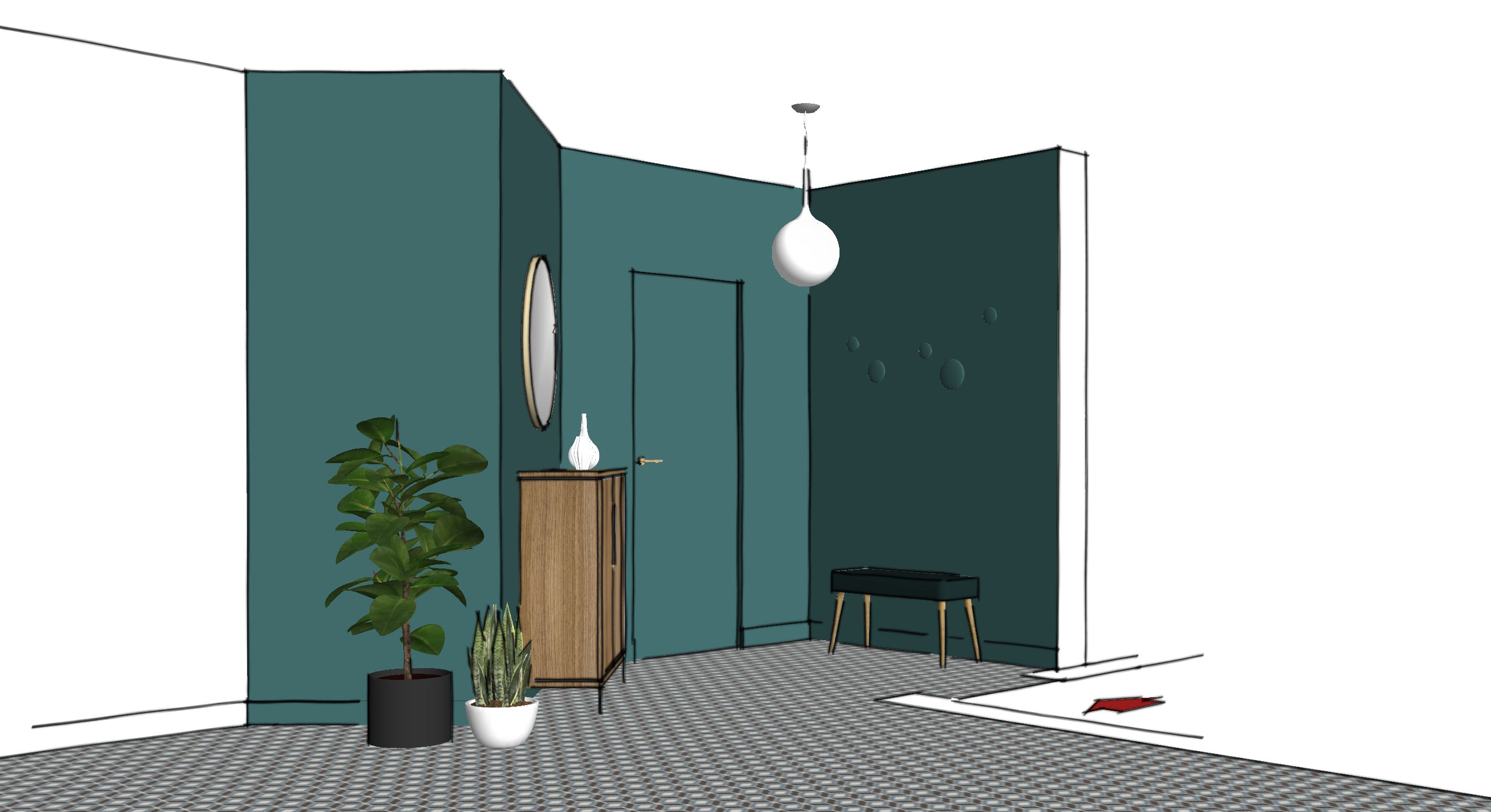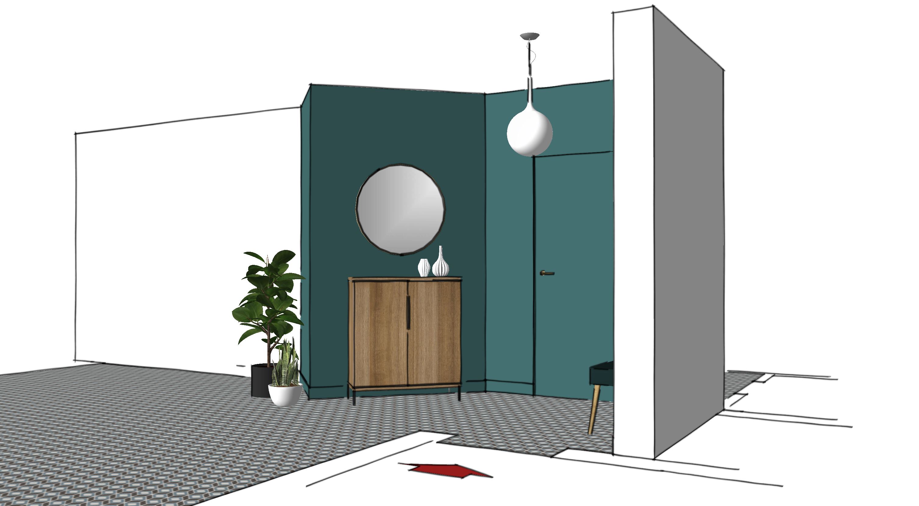 Ho arredato l'ingresso in verde petrolio, colore presente nella texture a pavimento. Sulle pareti e sui dettagli. La porta verso la zona notte è stata sostituita con una filo muro. Laccata color pertolio come le pareti sembra che non ci sia.