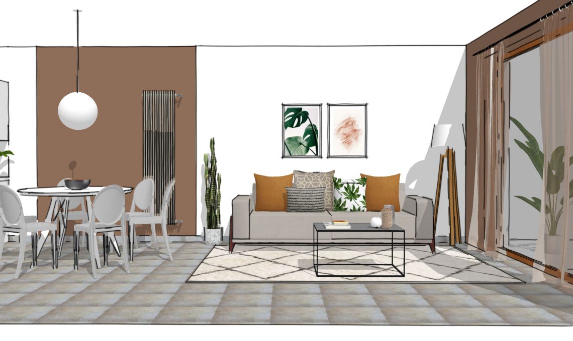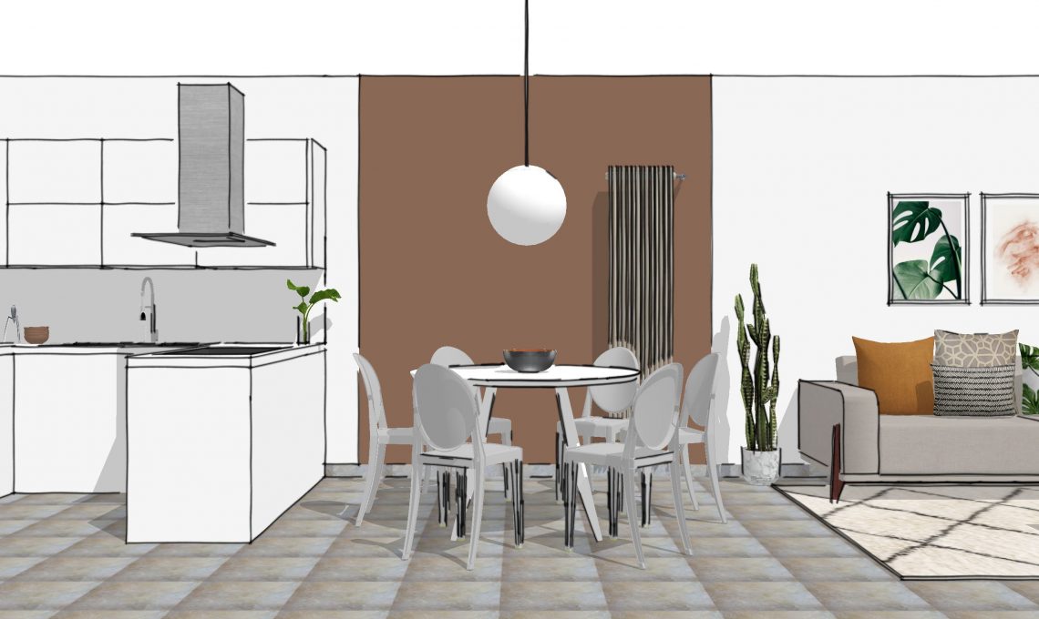 Lo sfondo sarà bianco. Tingo solo porzioni di parete. Una quinta colore in corrispondenza della zona pranzo centrale e colore sulla parete della portafinestra verso il terrazzo. In questo modo gli spazi sembrano alternarsi, si collocano e si identificano.