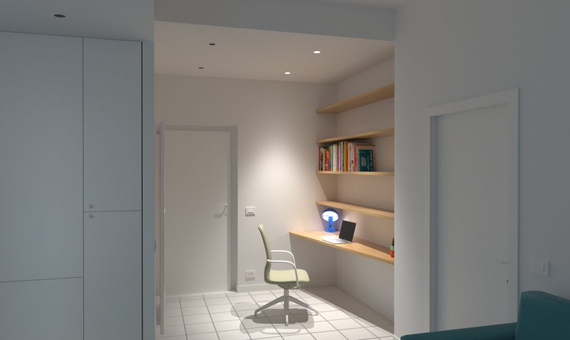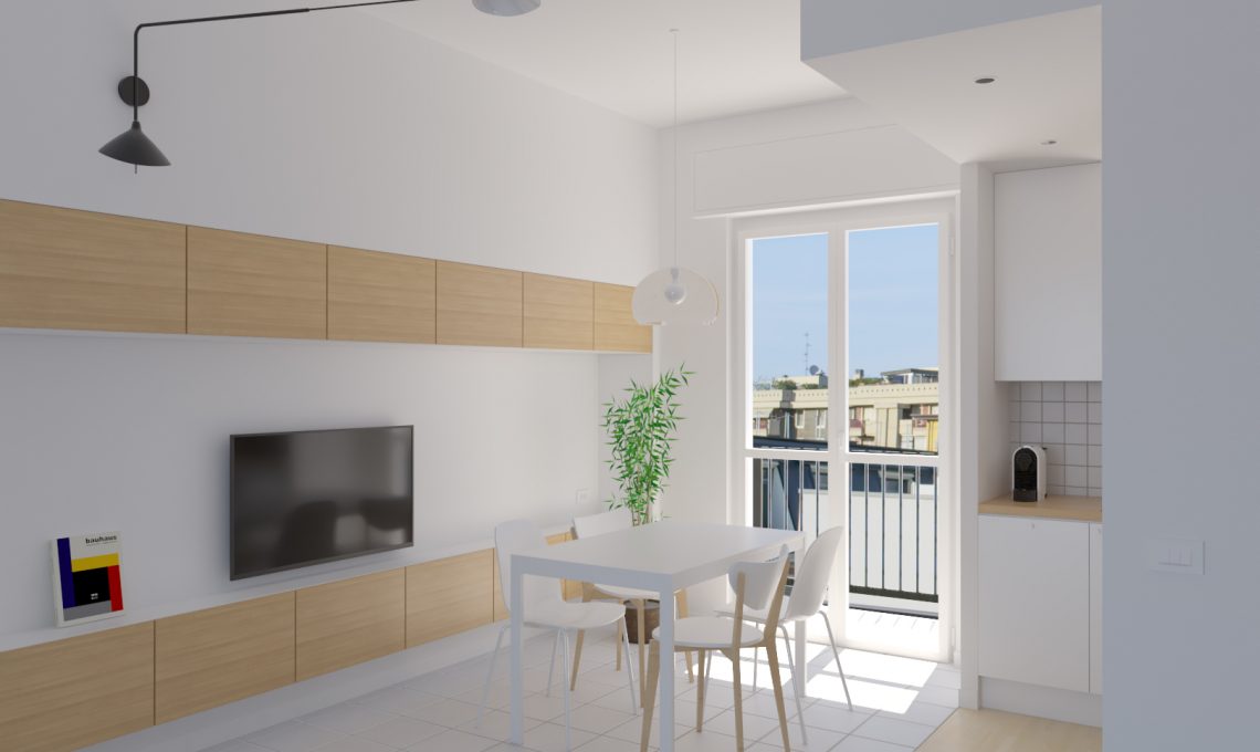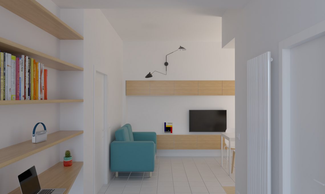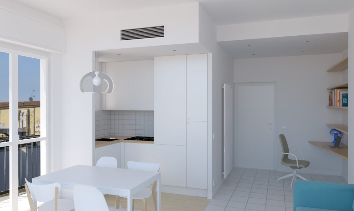 Gli interventi murari si limitano all’apertura dell’angusta e scomoda cucina, in modo da creare un open space con funzioni di ingresso, living, pranzo e cucina.