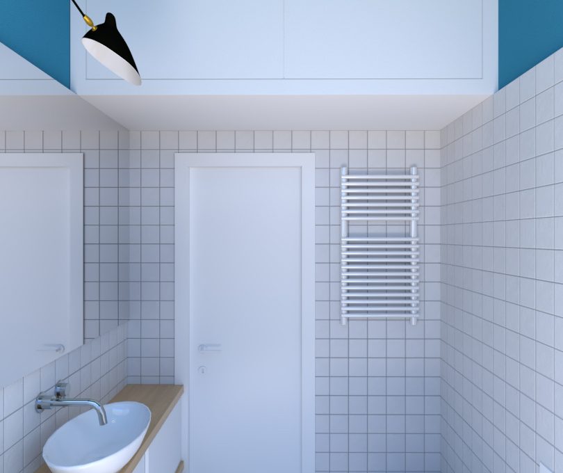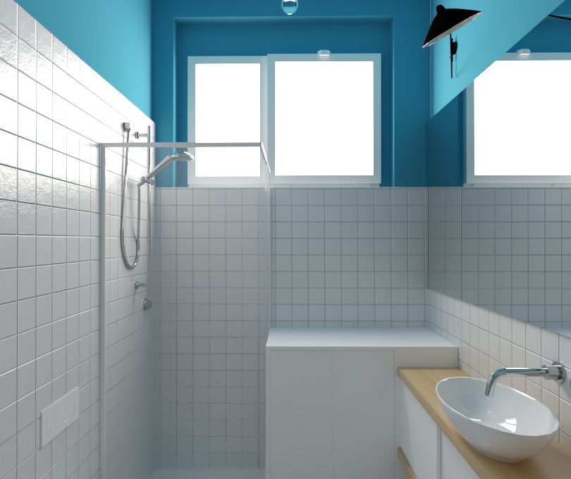 Nel bagno, per sfruttare al meglio lo spazio a disposizione, si è scelto di realizzare su disegno il mobile lavabo e un mobile lavanderia, posizionato di fianco alla doccia. Le superfici di pareti e soffitto non piastrellate sono dipinte in blu. Questo accorgimento, oltre a dare una nota di colore, riproporziona otticamente lo spazio, unitamente allo specchio a tutta lunghezza, riducendo la sensazione di ambiente alto ma piccolo.