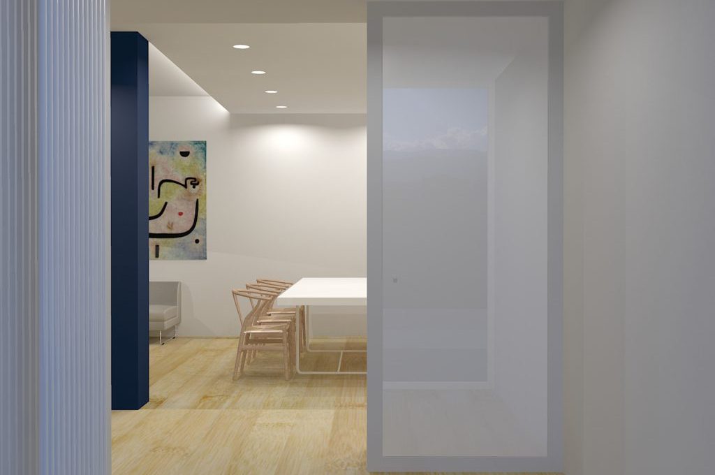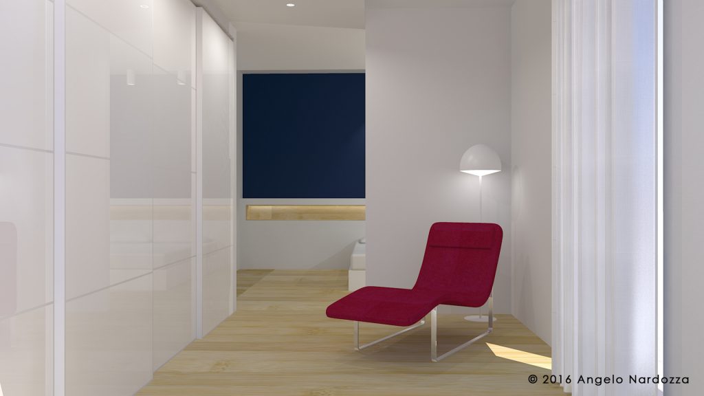 Nel progetto l'intero piano terra è destinato a zona giorno con studio. Al primo piano il vecchio soggiorno/sala da pranzo di 28 mq è diventato un'ampia camera matrimoniale con zona letto e zona relax/spogliatoio.