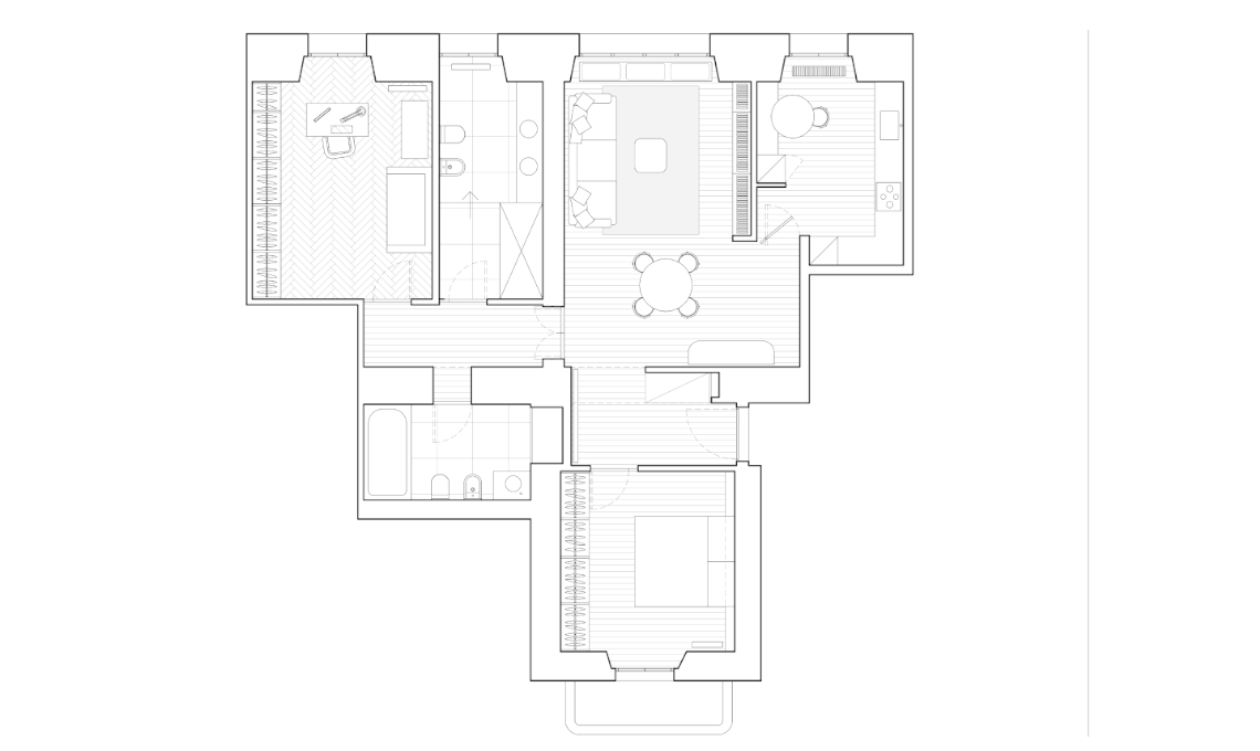 Un appartamento d’epoca con muri spessi, soffitti alti e già ben suddiviso. La ristrutturazione ha previsto solo una piccola modifica muraria che ha permesso una migliore distribuzione tra cucina e soggiorno.