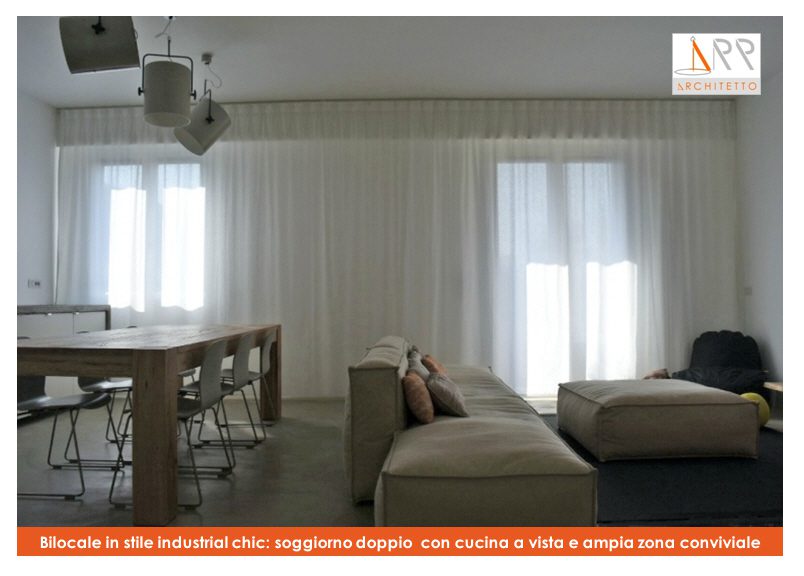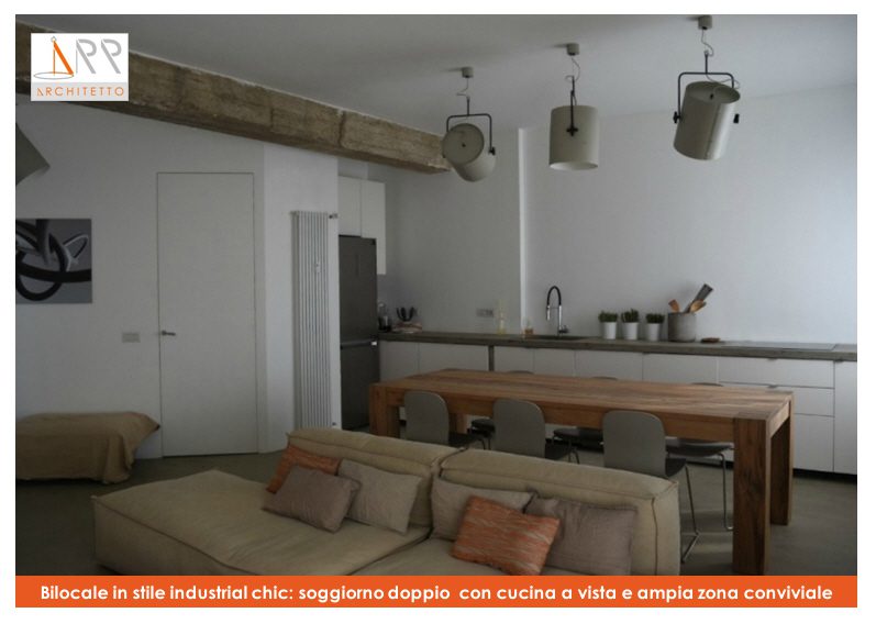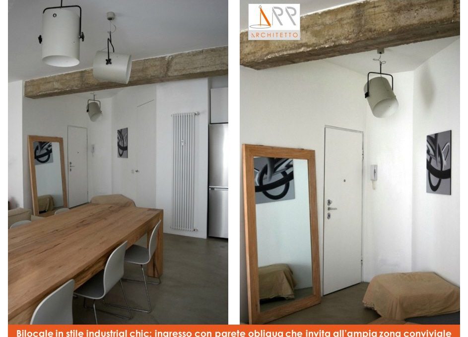 Il bilocale esistente presentava un ampio ingresso sul quale si affacciavano tutti i locali, di dimensioni contenute. Ora un unico ampio spazio, di ben 40 mq, è stato dedicato alla zona conviviale con una zona notte, verso cortile, ben distinta
