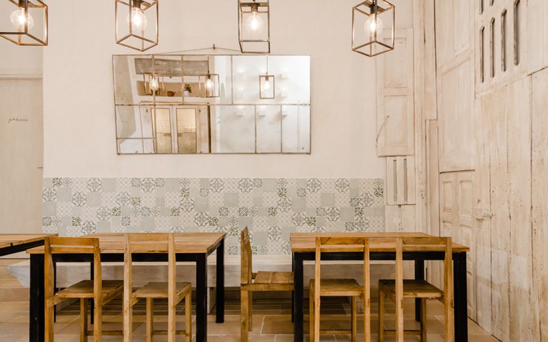 Gli arredi, appositamente disegnati per il locale, riprendono il carattere rurale delle masserie, ferro e legno grezzo.
