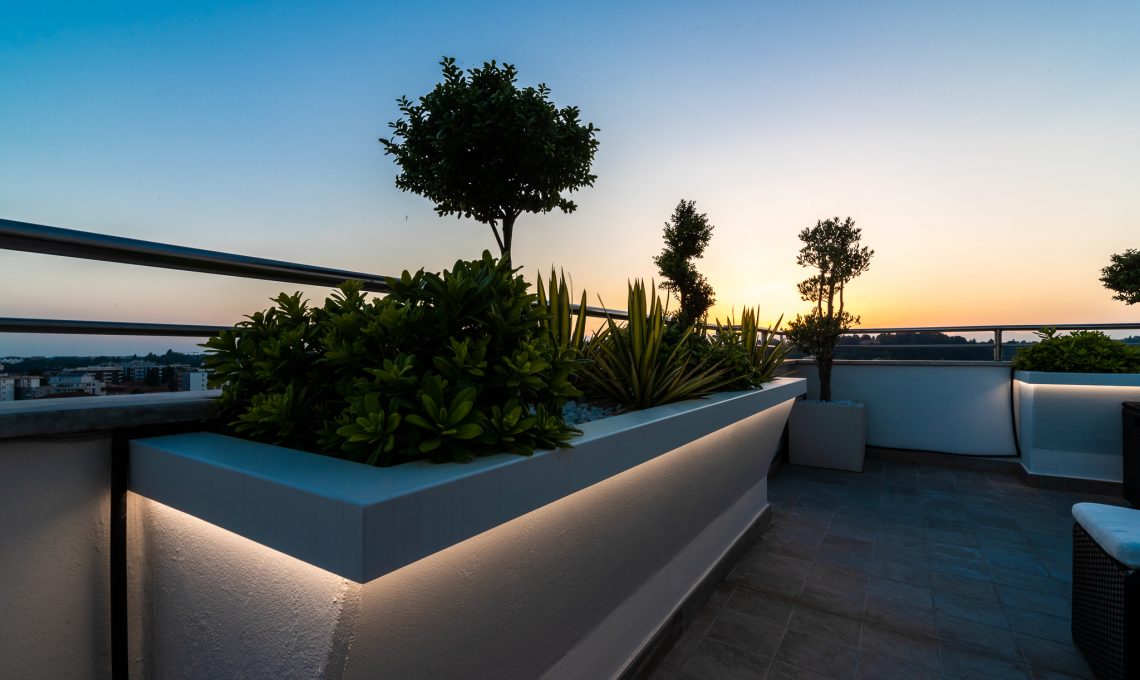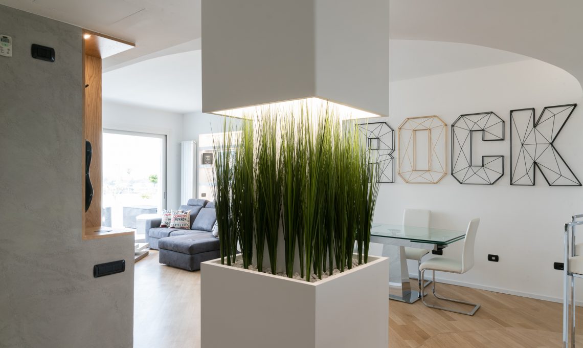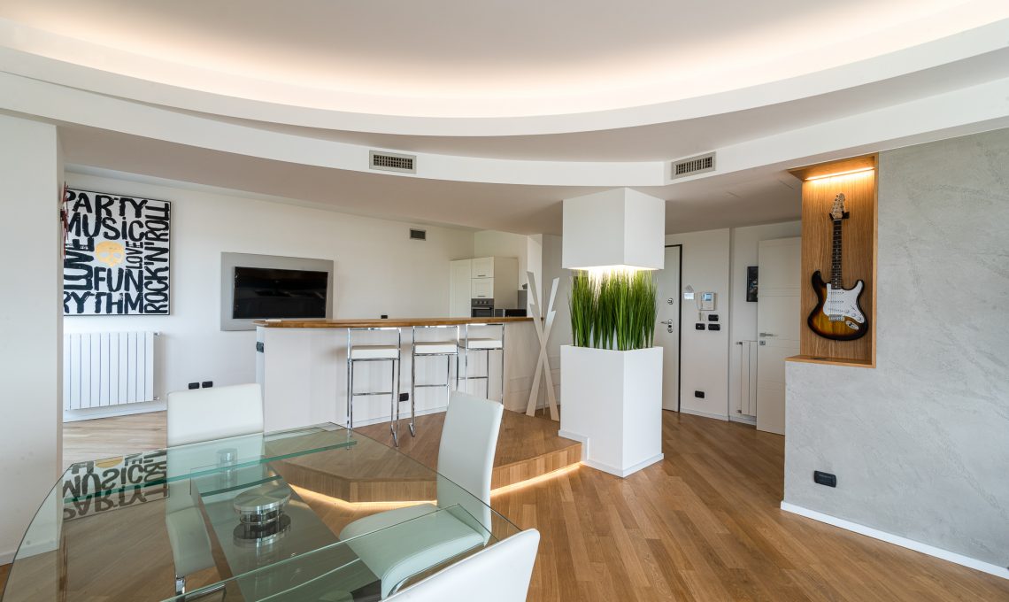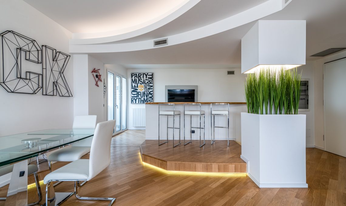 La zona giorno ospita soggiorno, zona pranzo, pedana rialzata con luce led radente e zona bancone, ampia zona cucina aperta sul living. Un pilastro esistente prima coperto da una struttura tonda è stato messo in risalto con la realizzazione di un elemento pilastro-fioriera in cartongesso. L’altezza della fioriera è stata studiata in modo da garantire la visibilità di tutta la stanza. La nicchia d’angolo in legno è stata realizzata con pannelli di rovere e luce strip led incassata, anche questa è stata pensata per fare correre lo sguardo oltre l’angolo e ampliare la percezione dello spazio. Una nicchia esistente dietro il divano prima dedicata alla zona TV è stata modificata diventando una libreria con ripiani in cartongesso con illuminazione incassata.Il terrazzo è stato riportato a nuova vita con la sostituzione della pavimentazione esistente e la realizzazione di scossaline di metallo su disegno per coprire i bordi superiori delle fioriere. Queste scossaline ospitano un sistema di illuminazione a luci led RGB che consente la modifica del colore e creano l’illuminazione d’effetto dell’esterno. Luci led delle fioriere esterne e della pedana interna sono controllabili sia tramite comando a parete che app smartphone.