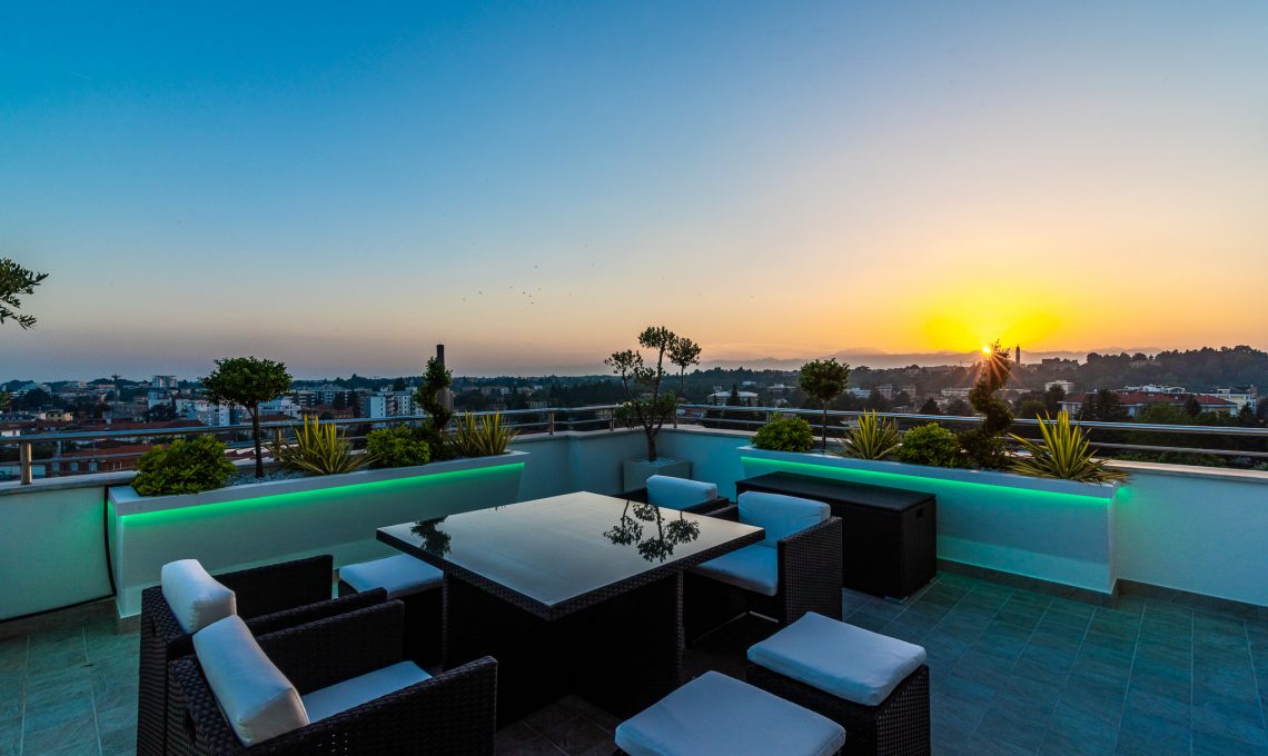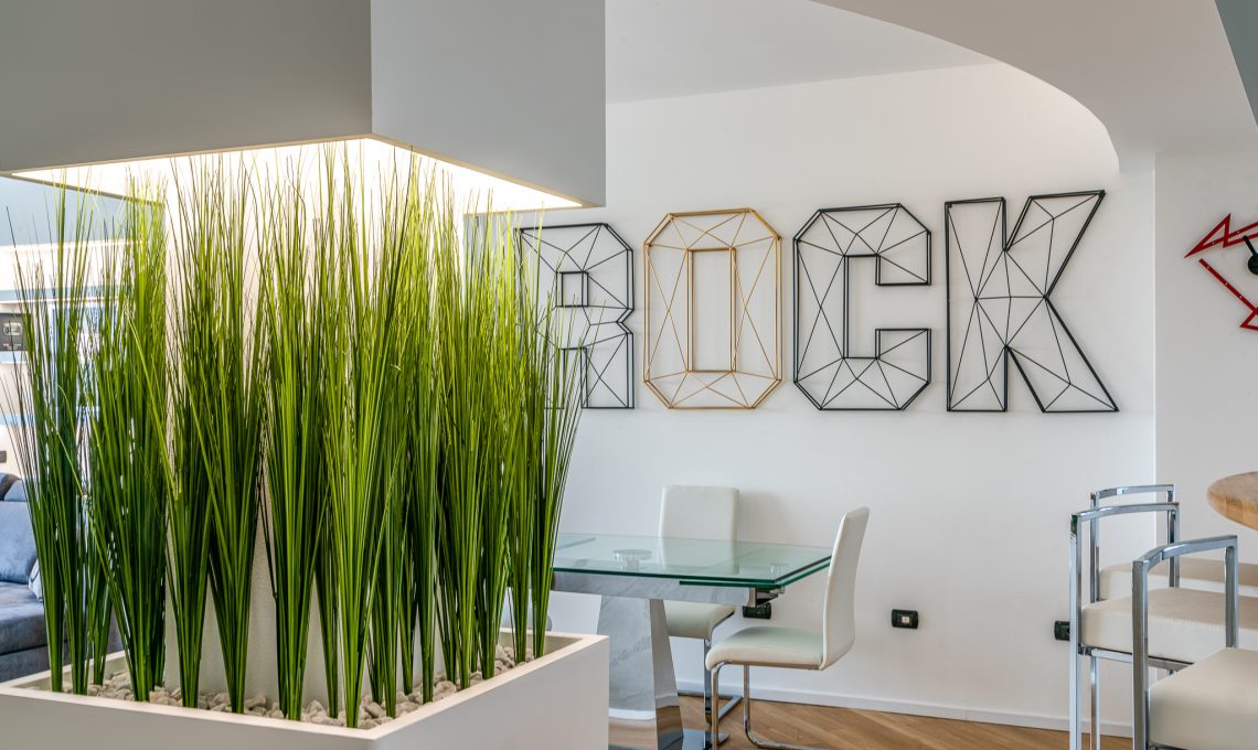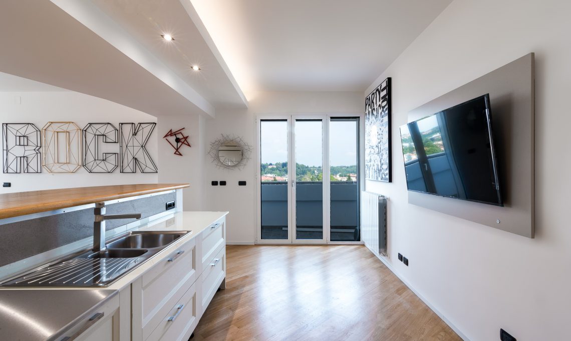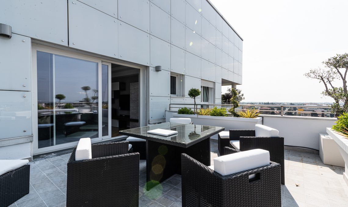 La zona giorno ospita soggiorno, zona pranzo, pedana rialzata con luce led radente e zona bancone, ampia zona cucina aperta sul living. Un pilastro esistente prima coperto da una struttura tonda è stato messo in risalto con la realizzazione di un elemento pilastro-fioriera in cartongesso. L’altezza della fioriera è stata studiata in modo da garantire la visibilità di tutta la stanza. La nicchia d’angolo in legno è stata realizzata con pannelli di rovere e luce strip led incassata, anche questa è stata pensata per fare correre lo sguardo oltre l’angolo e ampliare la percezione dello spazio. Una nicchia esistente dietro il divano prima dedicata alla zona TV è stata modificata diventando una libreria con ripiani in cartongesso con illuminazione incassata.Il terrazzo è stato riportato a nuova vita con la sostituzione della pavimentazione esistente e la realizzazione di scossaline di metallo su disegno per coprire i bordi superiori delle fioriere. Queste scossaline ospitano un sistema di illuminazione a luci led RGB che consente la modifica del colore e creano l’illuminazione d’effetto dell’esterno. Luci led delle fioriere esterne e della pedana interna sono controllabili sia tramite comando a parete che app smartphone.
