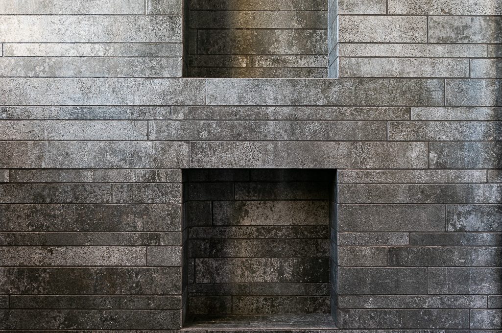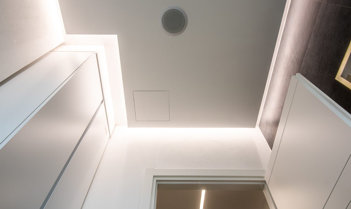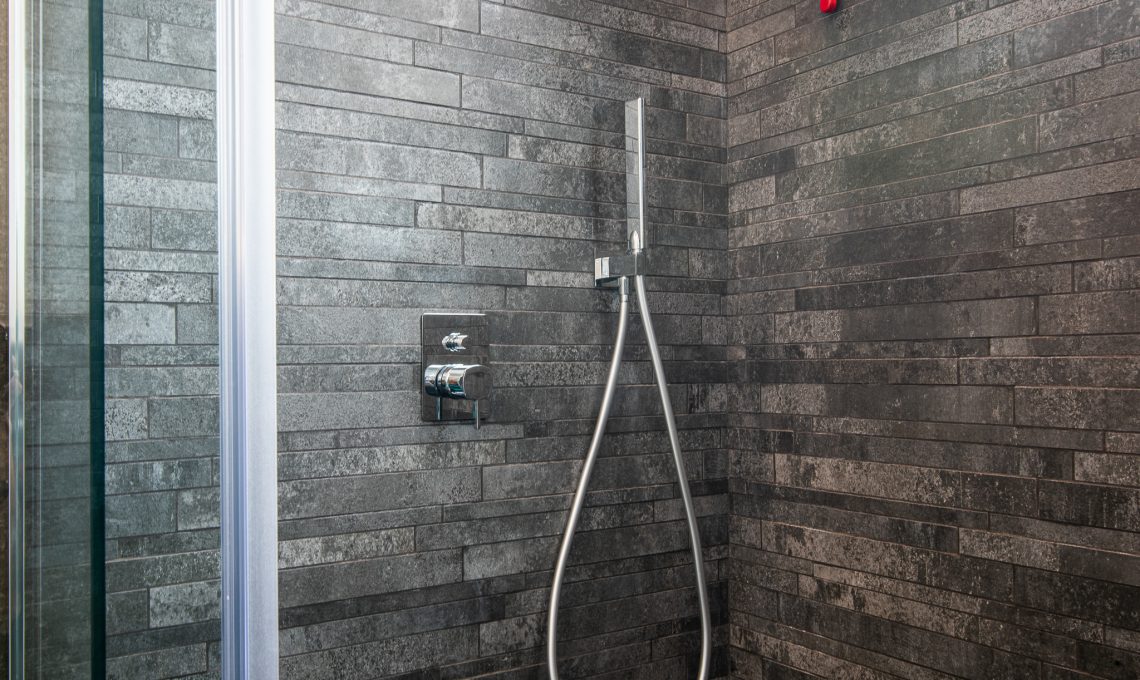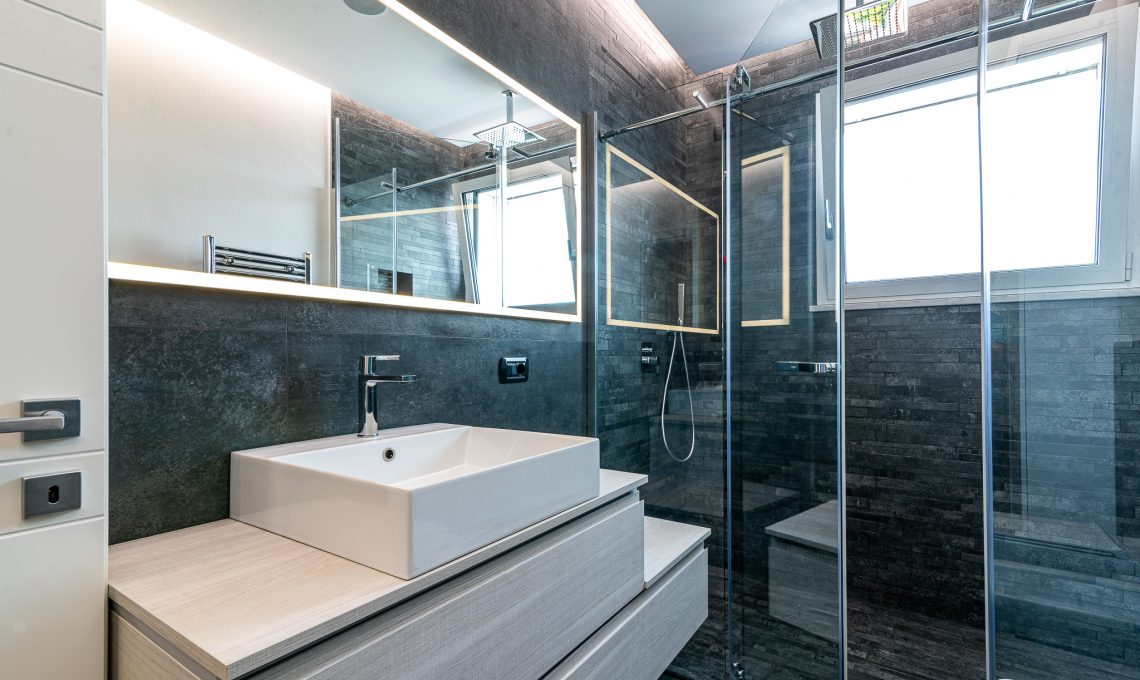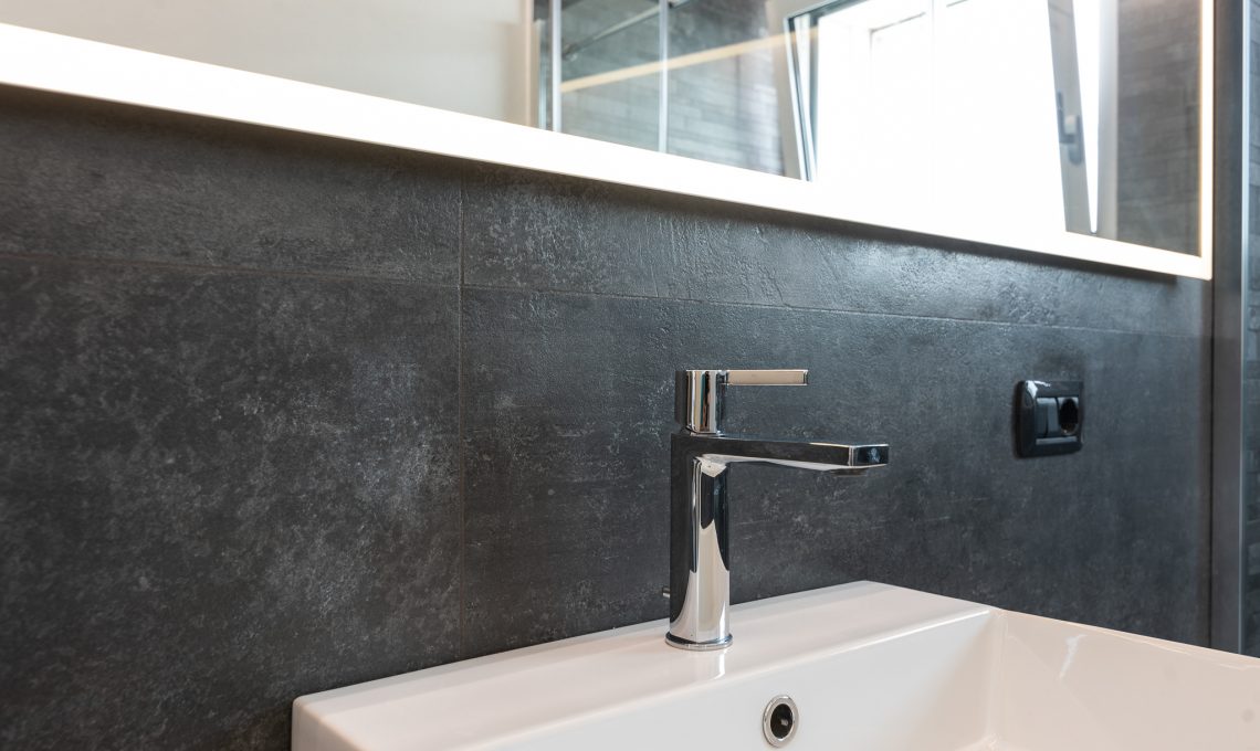 Il bagno è stato rivisto mantenendo le posizioni degli attacchi idraulici esistenti, utilizzando piastrelle 120×60 cm per la zona sanitari e a listello sfalsato per l’interno doccia sia a muro che a pavimento (Florim modello RawTech Coal). Il soffitto presenta un ribassamento centrale che ospita un sistema audio bluetooth composto da due casse incassate, mentre l’illuminazione è posizionata lungo il bordo del controsoffitto, questo offre una illuminazione radente che esalta le venature dei rivestimenti ceramici.