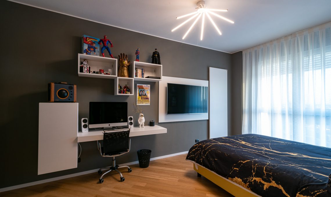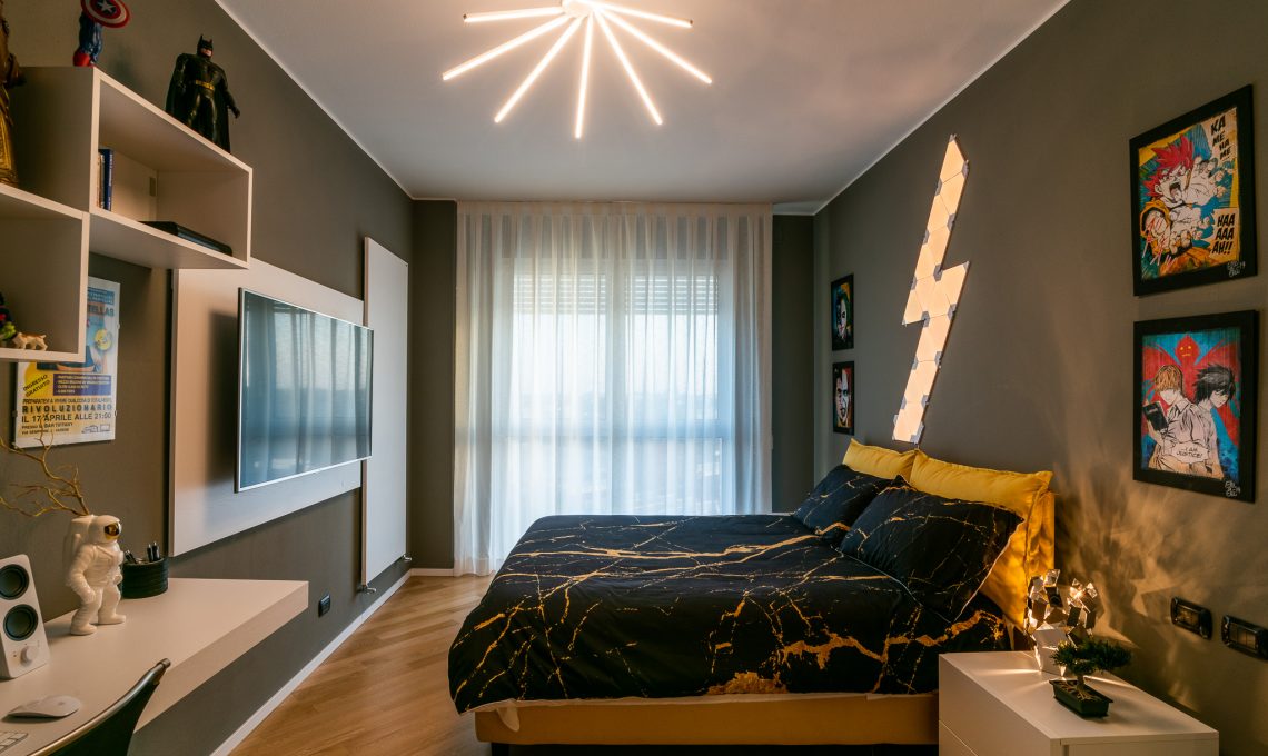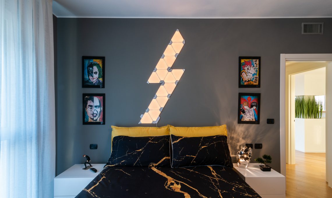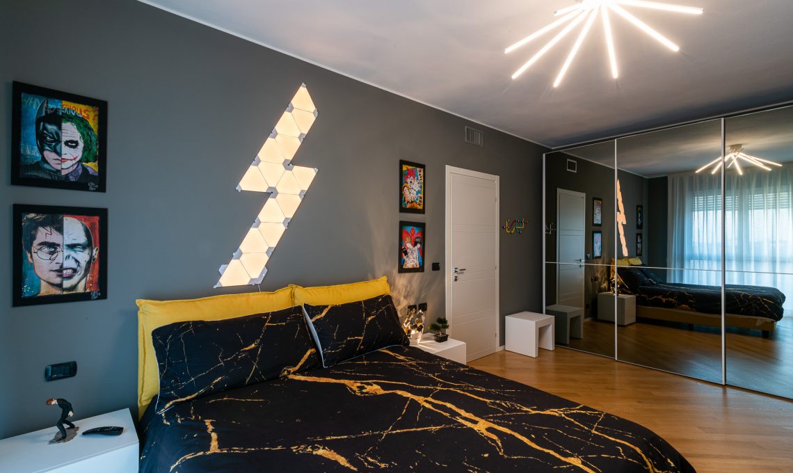 La camera da letto presenta una tinta grigio scuro a muro a contrasto con gli arredi in legno bianco. L’armadio con ante a specchio fumè aumentano la percezione dello spazio. L’illuminazione è affidata a corpi illuminanti dalle linee decise e da pannelli led Nanoleaf controllabili da smartphone.