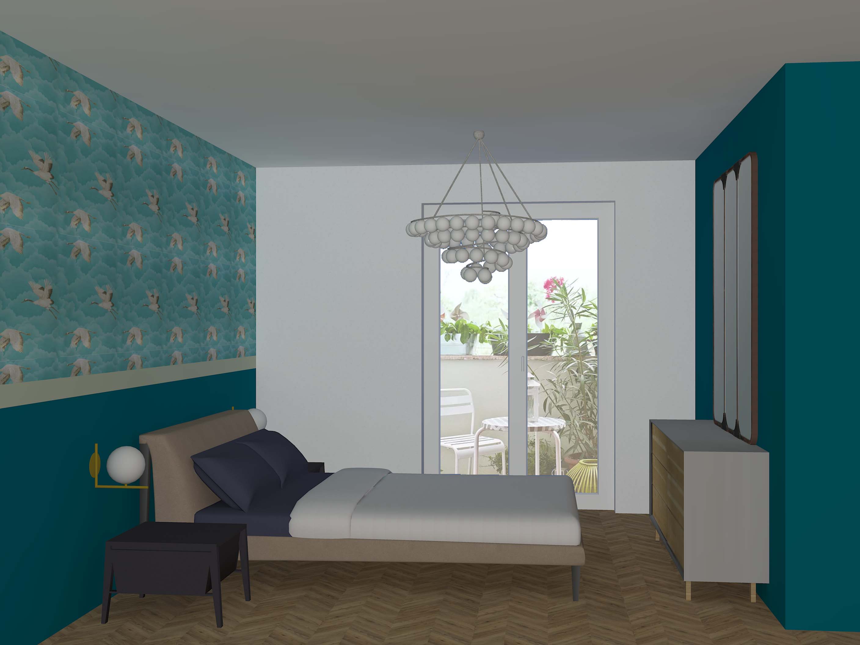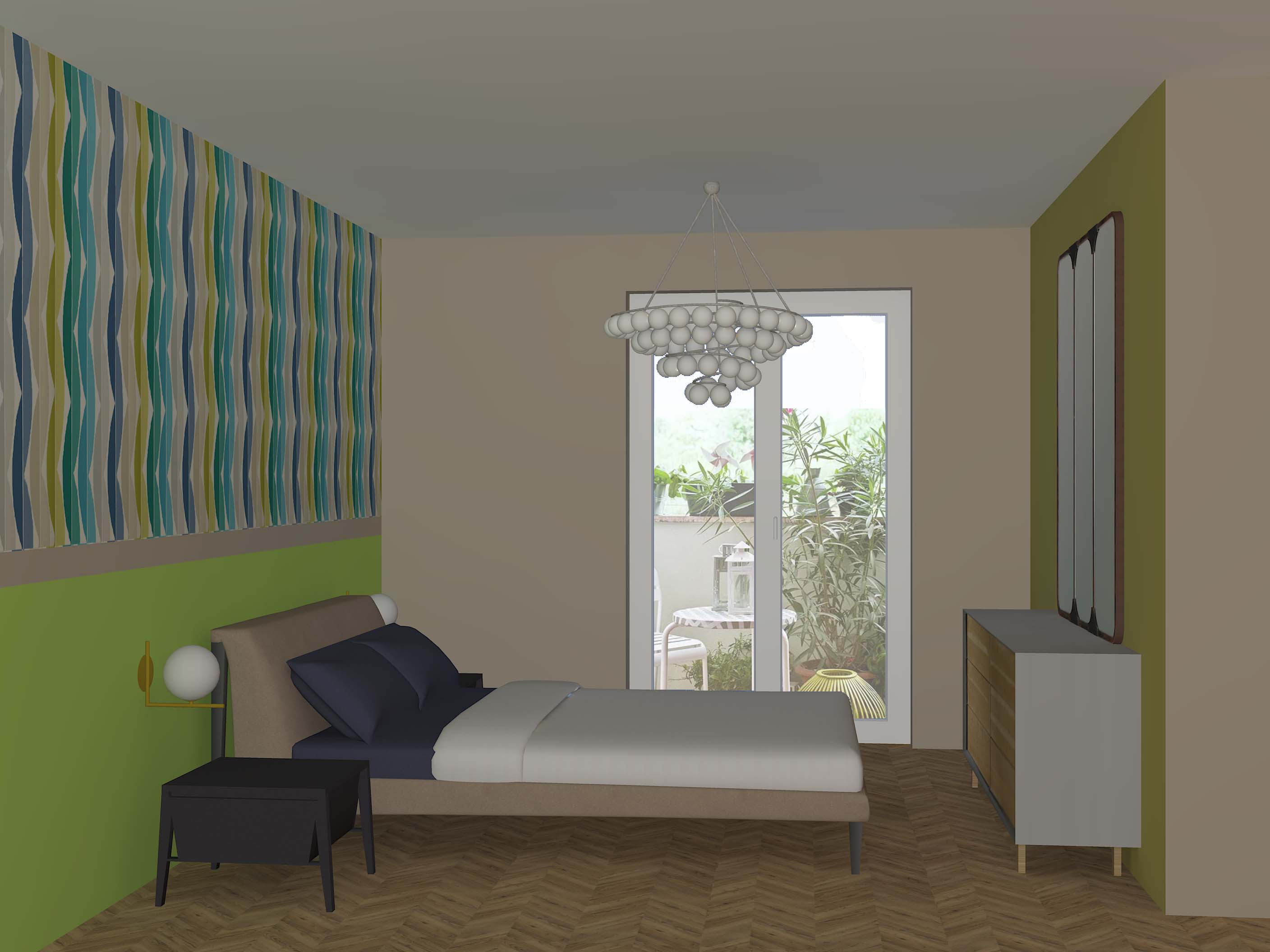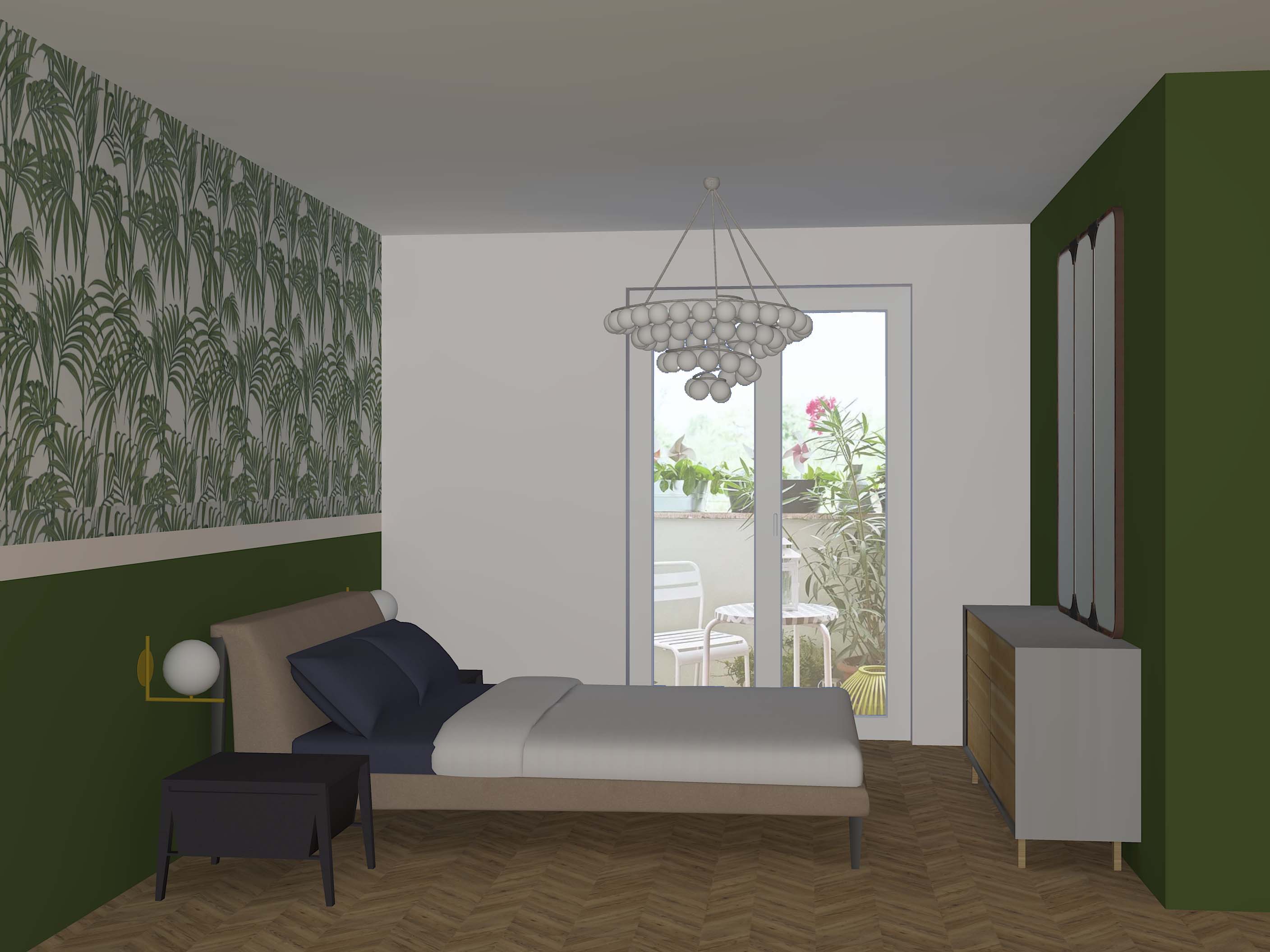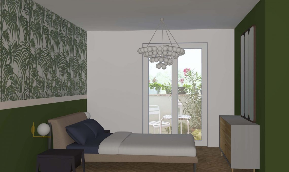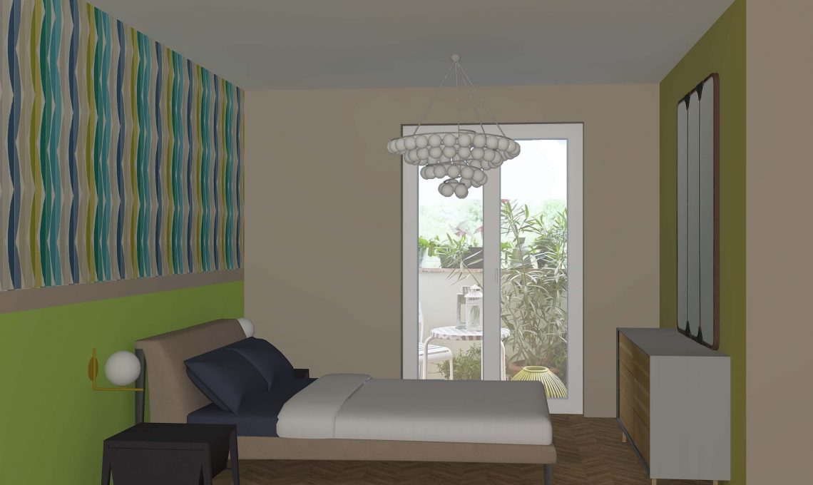 La tinta della finta boiserie sarà poi richiamata nella parete opposta, di fronte al letto.