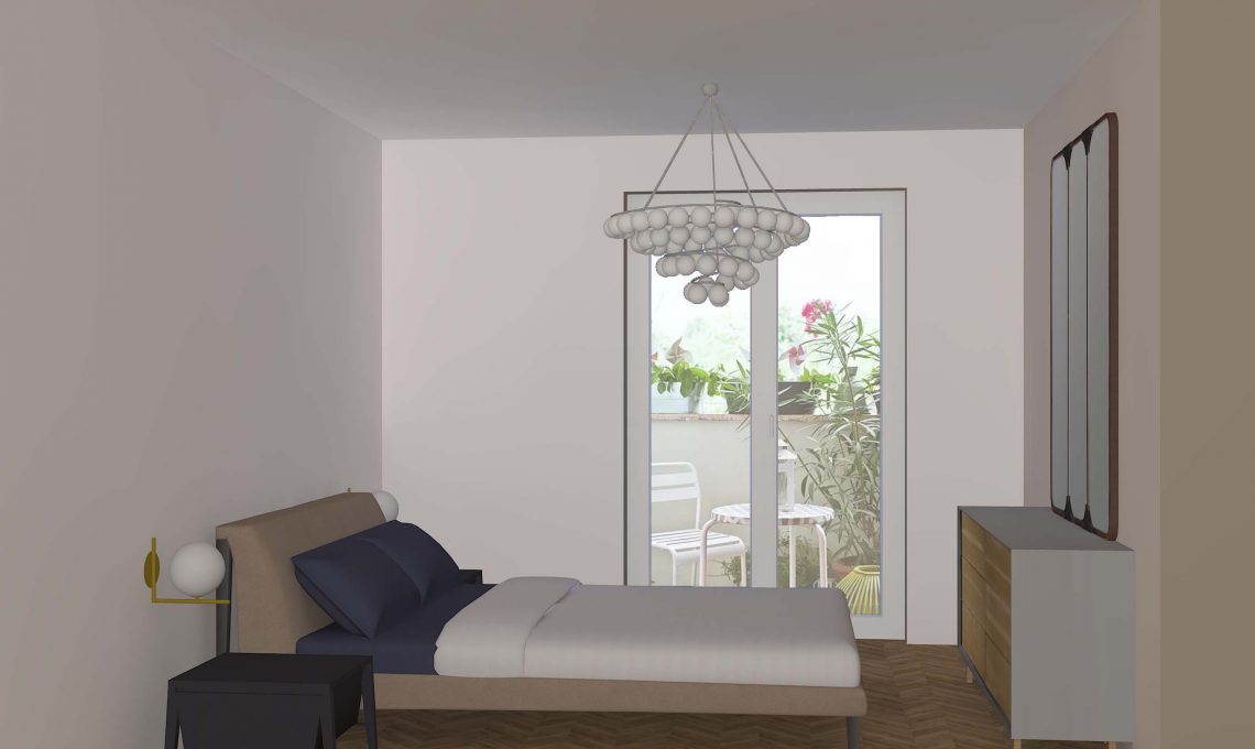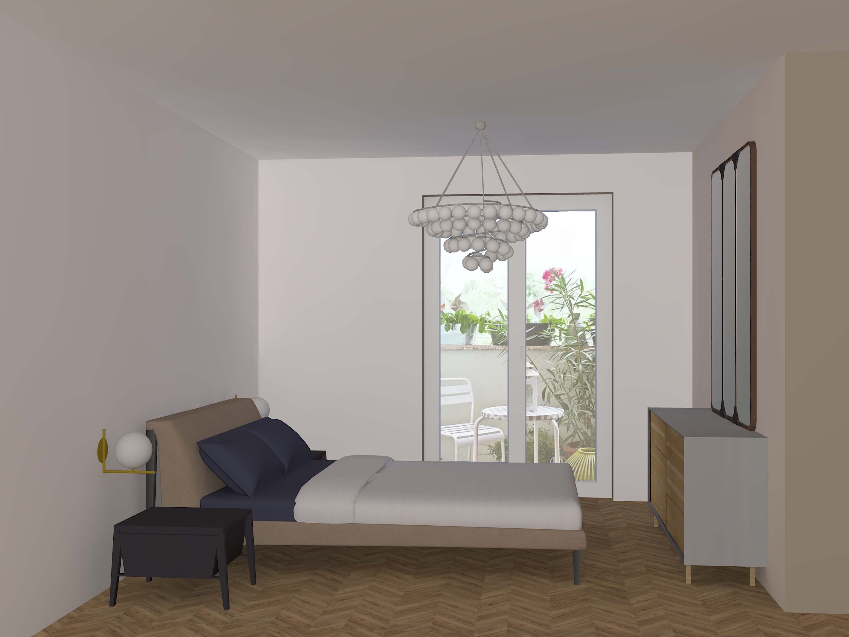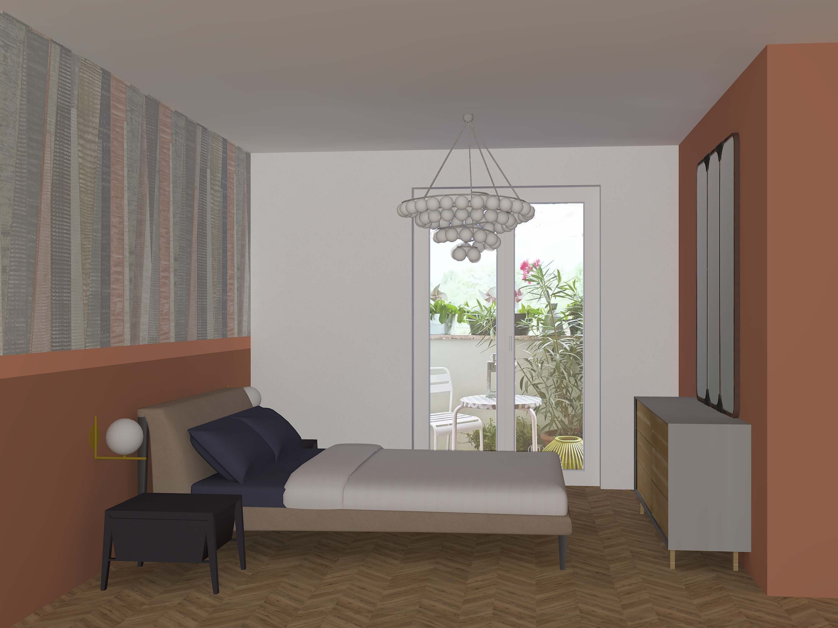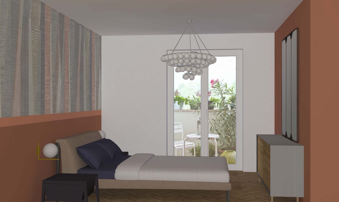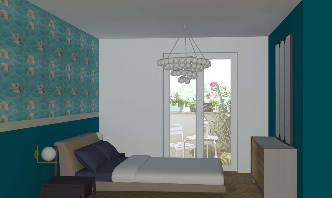 La tinta della finta boiserie sarà poi richiamata nella parete opposta, di fronte al letto.