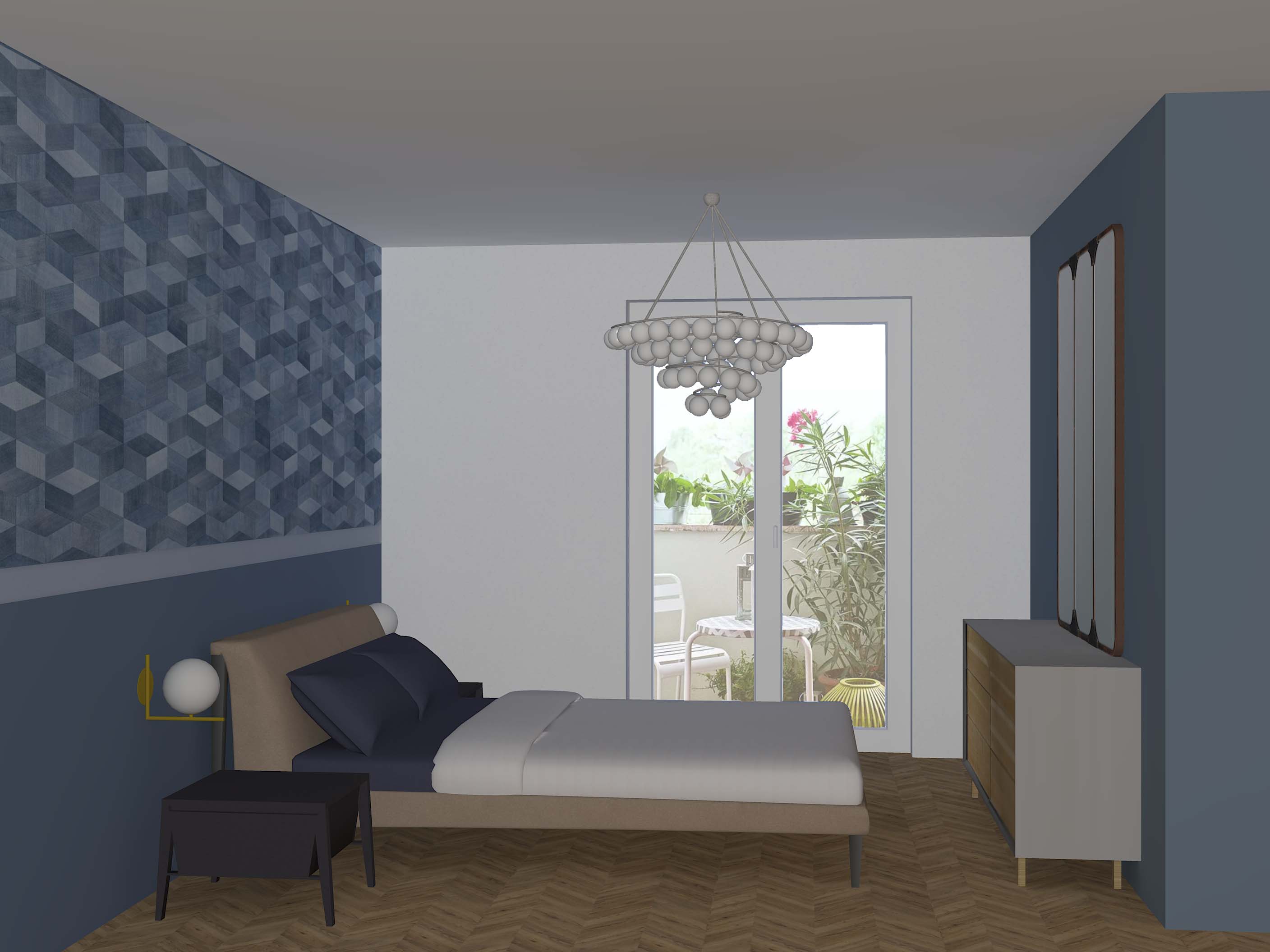 Per la parete contro cui è appoggiata la testiera del letto ho immaginato di realizzare una finta boiserie tinteggiando la parte inferiore, per un altezza di circa 120 cm, e ricoprendo la parte superiore della parete stessa con una carta da parati scelta tra le infinite possibilità in commercio.