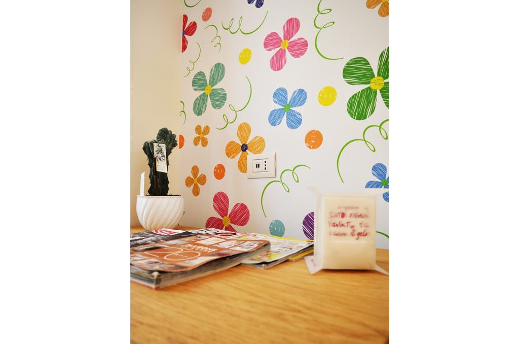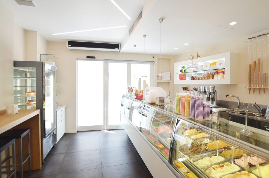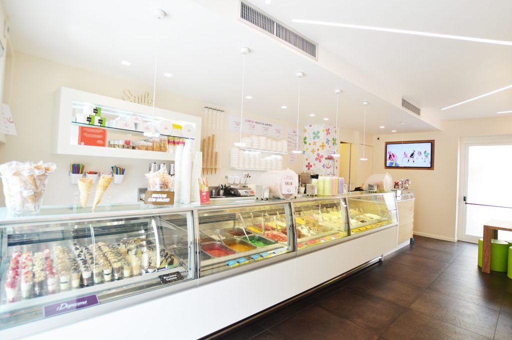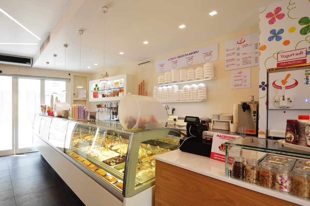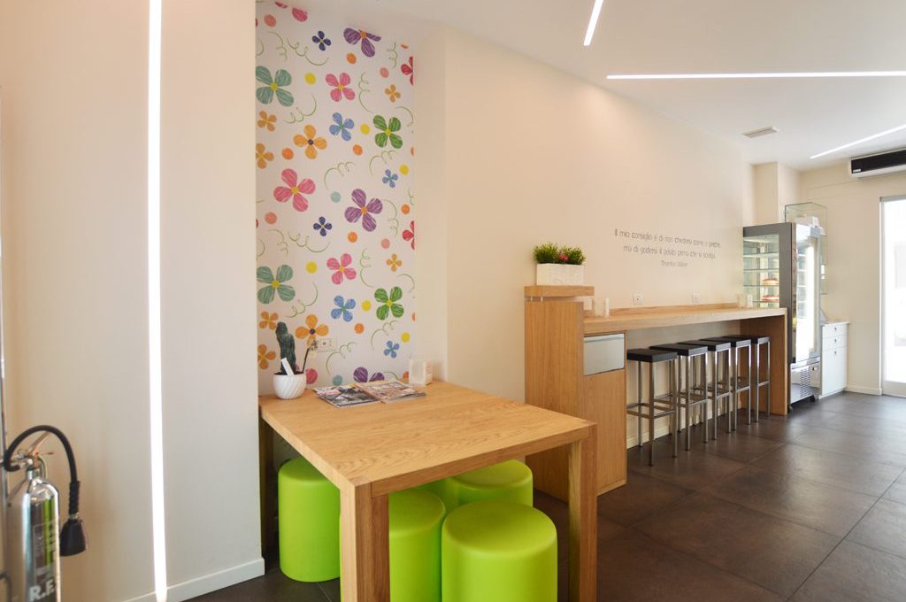 I colori neutri del legno e del bianco sono stati affiancati dai colori brillanti della carta adesiva collocata nella nicchia del tavolo e nel retro banco; con gli ottimi gelati si ha una vera esplosione di colore!!!