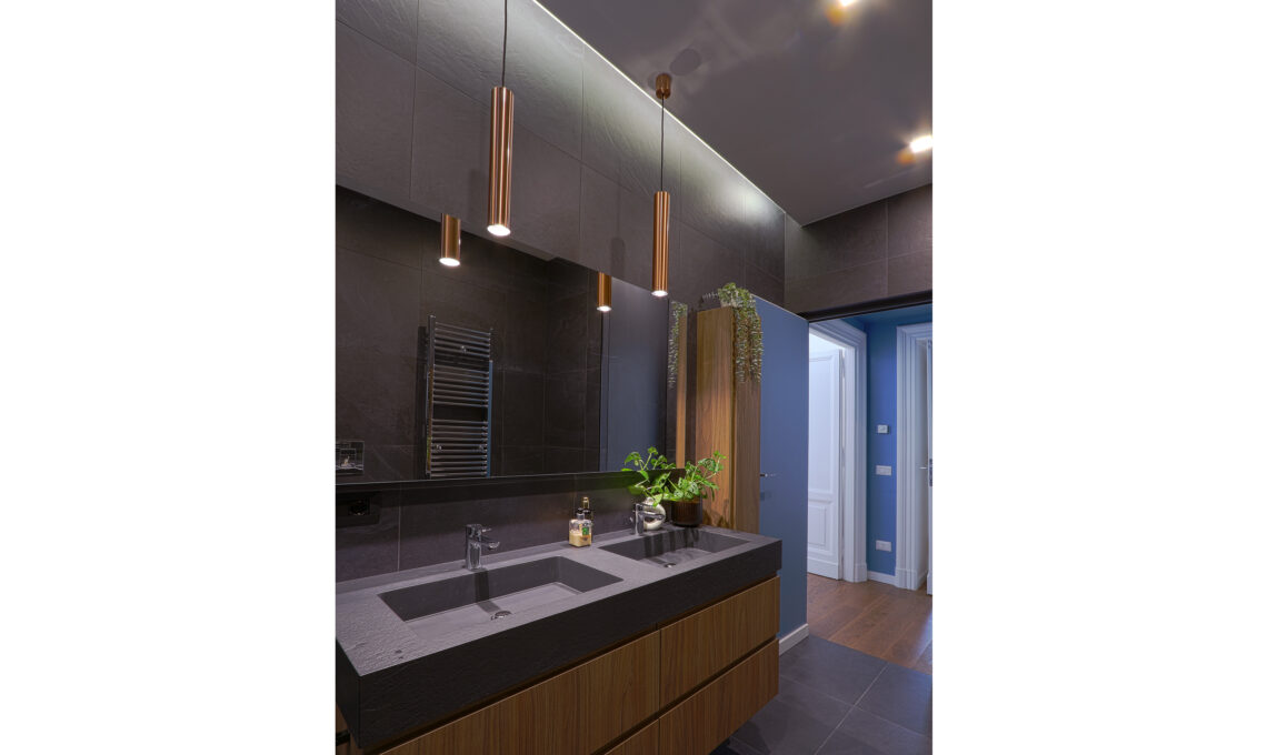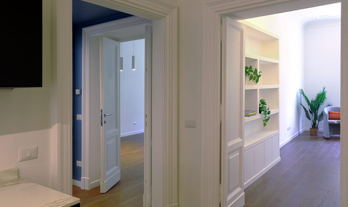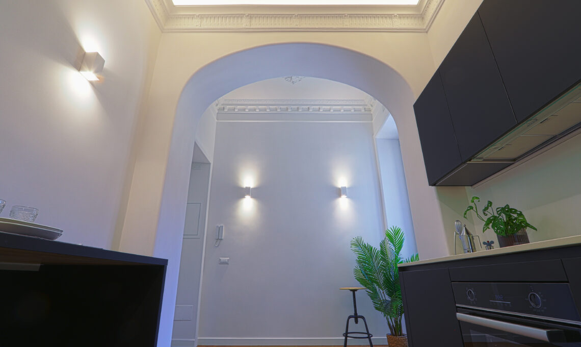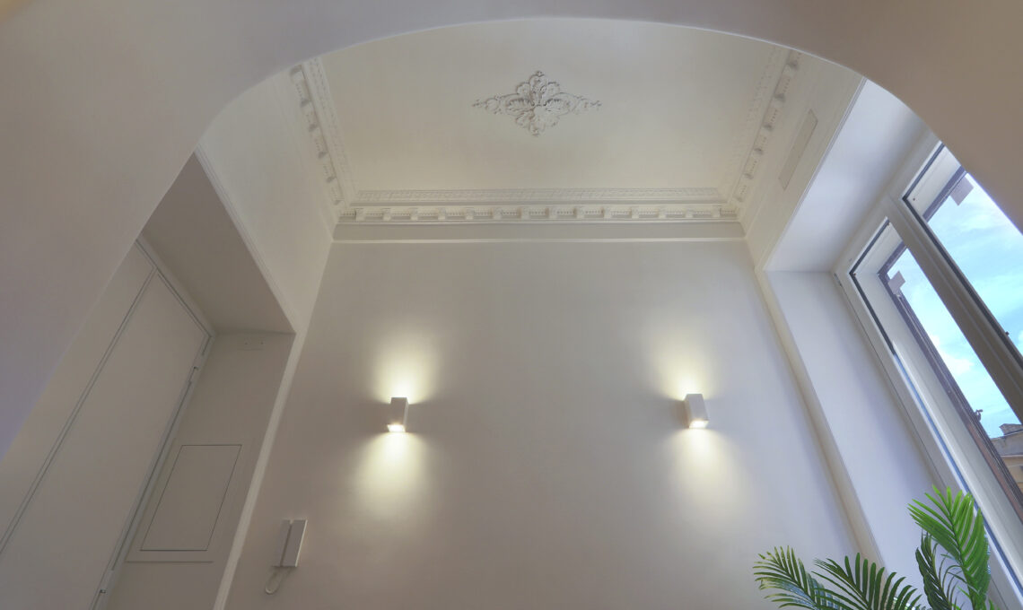 La scelta dell'illuminazione è stata minuziosamente calcolata per esaltare la maestosità dei soffitti, creando un gioco di ombre e luci affascinante. Questa sottile interazione tra elementi ultramoderni, come cucina e bagno, e dettagli d'epoca, come porte e stucchi, genera una sorprendente armonia, unendo passato e presente in un dialogo architettonico affascinante.