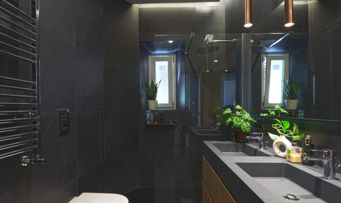 Le pareti e la porta del bagno, dipinte di un calmo colore carta da zucchero, insieme all'arredo del bagno, dai toni scuri e in rovere, riflettono un gusto moderno.