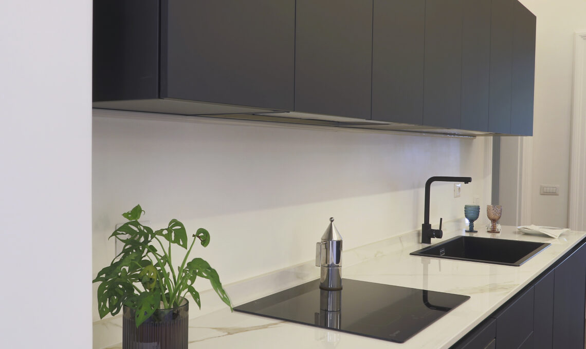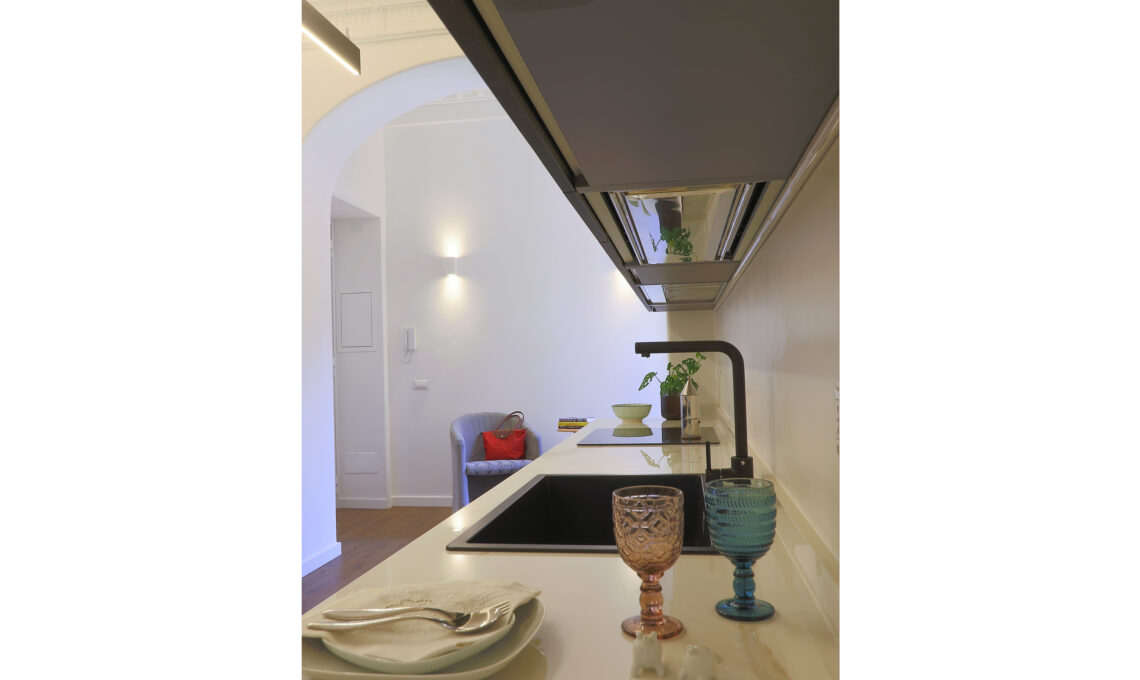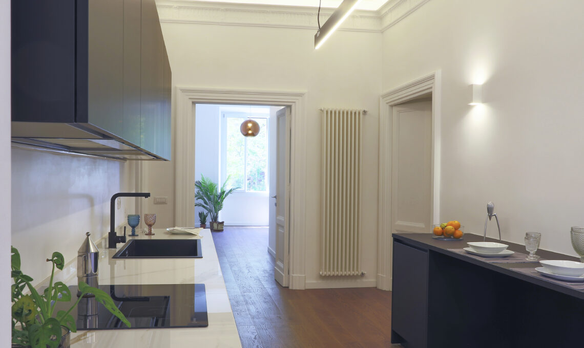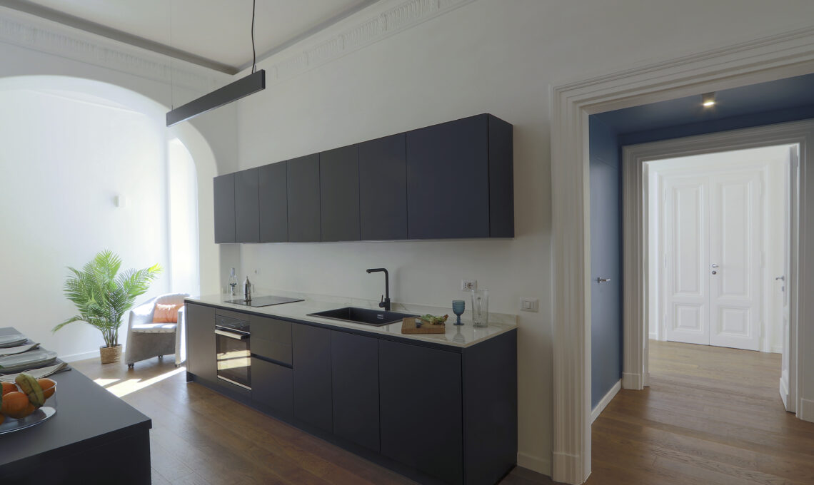 Le antiche porte in legno e i pregevoli stucchi sono stati sapientemente restaurati, risvegliando il loro fascino d'epoca. La cucina, un emblema dell'ultramoderno in total black, si erge come il cuore dell'abitazione. Posizionata nel vasto corridoio d'ingresso, trasformando un'area di semplice passaggio in uno degli spazi più invitanti dell'intero appartamento.