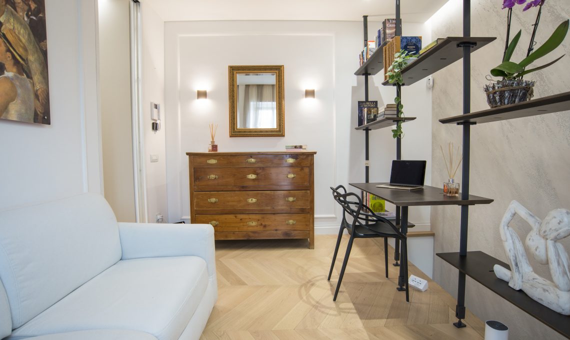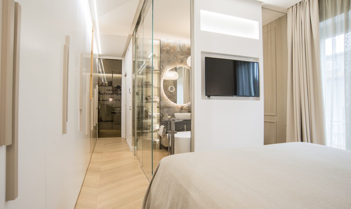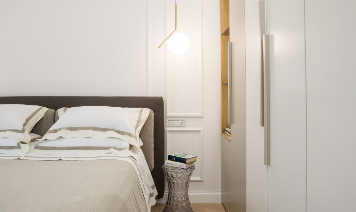 Per dare continuità all'atmosfera elegante e accogliente della zona notte, è stato scelto un parquet a spina francese che caratterizza tutto il primo piano. Abbiamo anche progettato parecchie falegnamerie su misura, che sono state realizzate dal nostro prezioso falegname per creare armadi realmente su misura per i clienti.