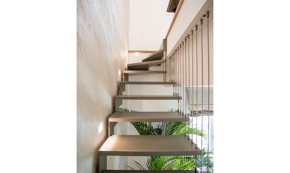 Per raggiungere questi obiettivi, è stato creato un buco nel solaio per inserire una scala interna che collegasse la zona giorno al piano terra con la zona notte al primo piano. La scala è diventata il punto focale della casa, resa scenografica dalla decorazione della parete con un intonaco particolare effetto travertino spaccato.