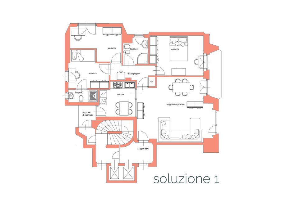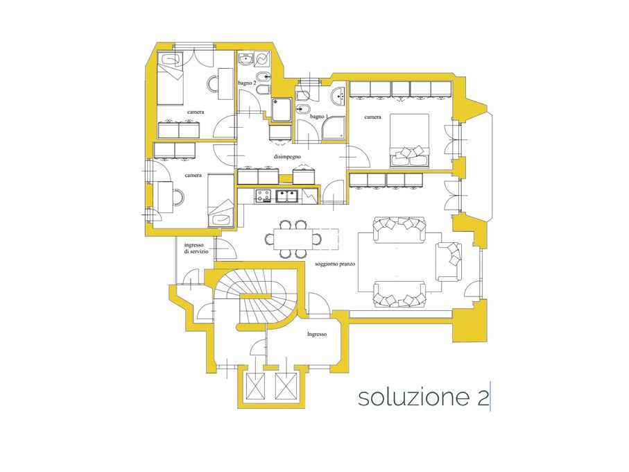 Le esigenze del cliente e la valutazione delle possibilità dello spazio determinano l’elaborazione, da parte del progettista, di alcune soluzioni distributive. Il cliente opera la scelta, valutando i punti di forza di ogni soluzione e i costi benefici della loro realizzazione. Nell'esempio illustrato la richiesta di progetto era: “adattare l’appartamento alla esigenze di una coppia con figli, possibilmente con pochi spostamenti murari". Le due soluzioni soddisfano in differente misura i due aspetti della richiesta. La pianta relativa allo stato di fatto ci mostra un appartamento di impostazione tradizionale, con due camere da letto, uno studio e una zona di servizi con accesso separato. La prima soluzione prevede con pochi interventi murari, la trasformazione dello studio in una camera da letto dotata di bagno proprio. La creazione di un letto in nicchia, che “sfonda” nella camera adiacente, dove il letto sarà in posizione sopraelevata, consente di equilibrare le dimensioni delle due camere. La seconda soluzione privilegia la considerazione dello stile di vita della famiglia, emerso durante le fasi di pre-progetto. La cucina si apre in continuità con la zona giorno per definire un più grande spazio di soggiorno per i momenti conviviali di tutti: genitori e figli, figli e loro amici, genitori e loro amici. In questa seconda soluzione, spazi, dotazione di arredi e accesso ai servizi, si distribuiscono equamente tra i componenti del nucleo famigliare in considerazione delle crescenti aquisizioni di indipendenza e necessità di privacy di ognuno.
