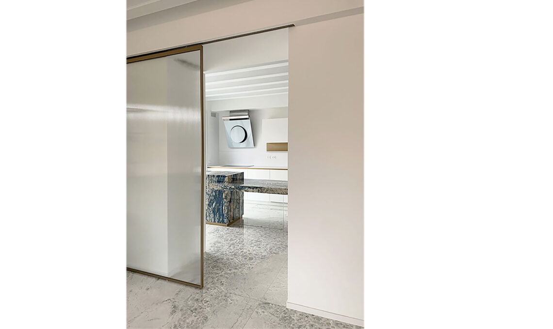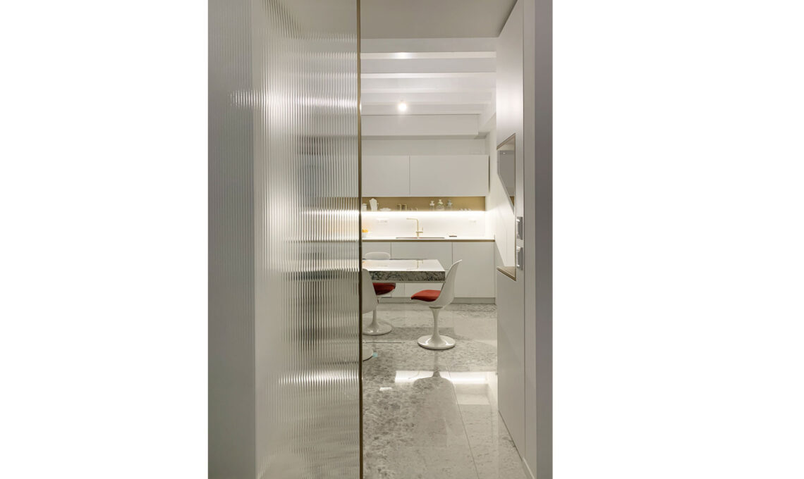La cucina è separata dal living da una grande porta in vetro cannettato, con cornice ottone. Il vetro cannettato, senza togliere luminosità, garantisce privacy alla cucina quando è chiuso; è un elemento decorativo dal sapore industrial retrò.
