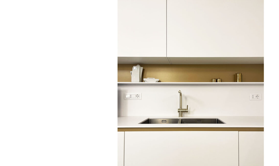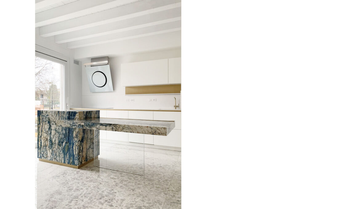 L’elemento centrale è un isola rivestita in un gres dalle particolari venature blu e verdi (Siberian Malachite di Mirage). L’isola risalta all’interno della cucina total white. Per il resto dell’arredo ho scelto infatti una laccatura bianca con pochi inserti di colore ottone, che danno un tocco personale all’ambiente.