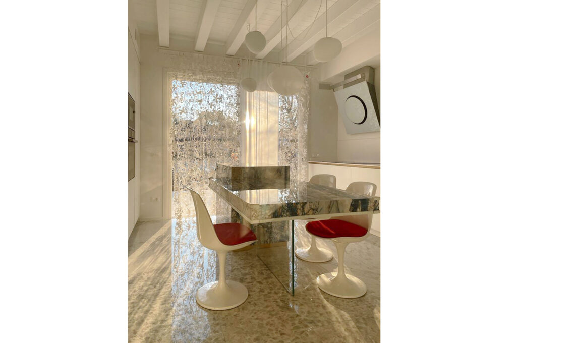 Per la zona living e tutto il piano terra ho optato per un pavimento in gres in grande formato: le lastre della pavimentazione sono 150 x150 cm, con un particolare disegno di cristalli, luminosissimo e molto raffinato (Gemstone di IRIS ceramiche).