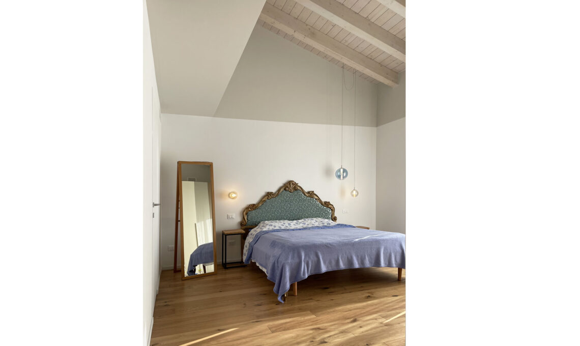 Le camere hanno soffitti alti con travi a vista. Per dare intimità a questi ambienti, nonostante l’altezza delle camere potesse creare un effetto ”dispersivo”, ho pitturato le pareti con una fascia bassa bianca ed una fascia grigio chiara nella parte alta, dello stesso colore del soffitto in legno.