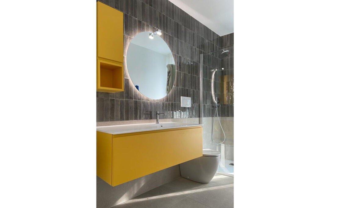 Ho scelto un mood vintage per il bagno degli ospiti, che ha un rivestimento in piastrelle effetto lacca di piccolo formato (Lume di Marazzi), valorizzato dallo specchio con retroilluminazione. Il rivestimento è nelle nuance di colore del grigio sabbia bagnato ed i mobili laccati giallo creano un contrasto molto vivace.